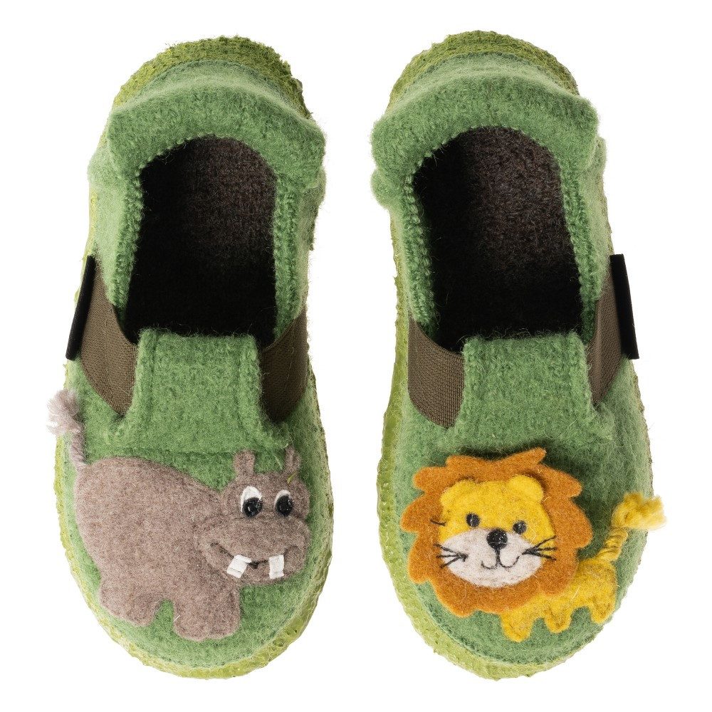 Modell: JUNGLE KINGS klassisches Hausschuhmodell in Slipperform zauberhafte Applikationen 100% Schurwolle rutschfeste Naturkautschuk-Sohle federleicht und super bequem weiche, gepolsterte Innensohle aus Baumwolle