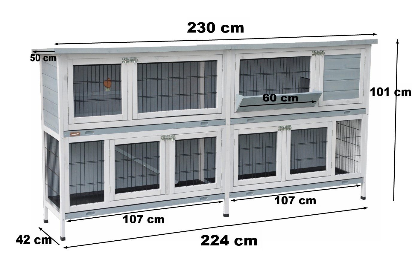 XXL Doppel-Kaninchenstall Bommel in der Deluxe Version aus hochwertigem Nadelholz. Mit 230 cm Gesamtbreite ausreichend Platz für mehrere Nager. Komplett durchgängig mit Rampenaufgang, großzügigem Untergeschoss und lackierten Draht. Für nagergerechte Haltung ohne Platzmangel. Der Kaninchenstall lässt sich mit den beigefügten Schrauben sehr schnell aufbauen und stellt auch für den nicht so versierten Handwerker kein Problem dar.