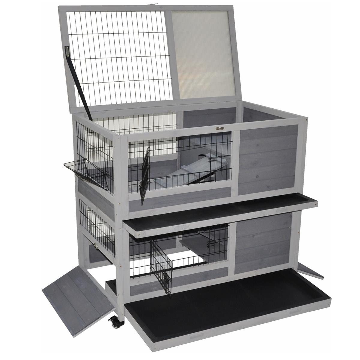 Er ist zweistöckig und auf Rollfüßen leicht beweglich und feststellbar. Zwei Kotschubladen lassen sich bequem herausnehmen und reinigen. Durch die beiden Gittertüren hat man einen leichten Zugriff auf den Innenbereich. Das obere, verschliessbare Dach lässt sich einfach öffnen für die gute Erreichbarkeit aller Stellen.