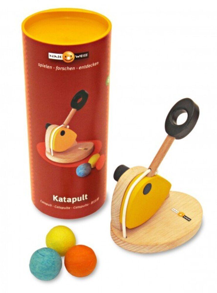 Mit dem Katapult lassen sich wohldosiert Papierkugeln verschießen. Das beiliegende Ziel zu treffen, ist ein kleine Herausforderung. Spannend wird es, wenn sich mehrere Spieler einen Pacour aus verschiedenen Zielen zurechtlegen – Papierkorb, Sofa, Hundekorb, Jackentasche etc. – und nach dem Vorbild des Cross-Golfens mit möglichst wenig Schüssen das letzte Ziel zu erreichen versuchen.