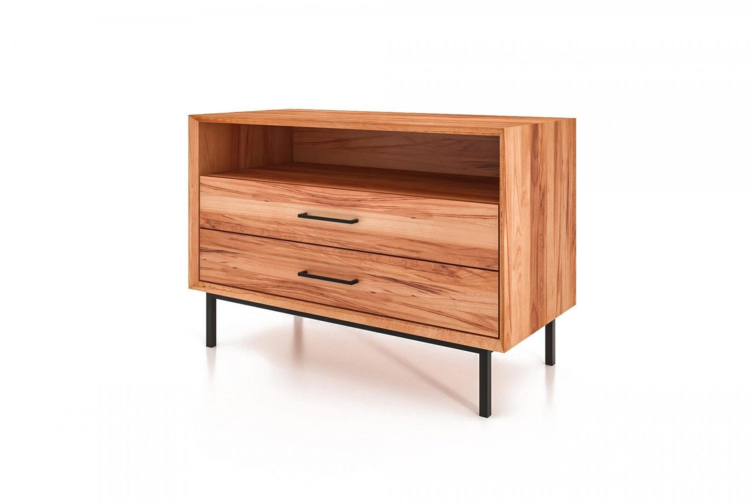 Diese Kommode ist ein Highlight hinsichtlich Design und Verarbeitung. Sie ist aus zwei cm starker massiver geölter Kernbuche gefertigt. Dieses Sideboard steht auf vier stabilen Metallbeinen in Schwarz. Es besitzt zwei Schubladen mit schwarzen Metallgriffen und darüber ein großes durchgehendes offenes Fach. Die Kommode bietet in den Schubladen und dem großen offenen Fach genug Platz zur Ablage verschiedener Utensilien und oben auch noch reichlich Platz für Dekoration. Ein sehr stylisches Möbelstück für Ihr Wohnzimmer oder Schlafzimmer. Passt ideal zu den weiteren Möbeln aus der Seiba-Serie.