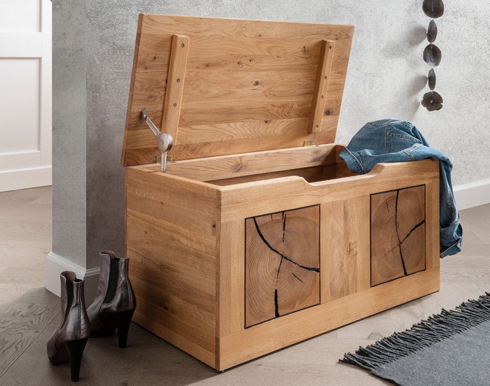 Die Truhe ist aus Eiche und ist geölt. Die Truhe macht mit seinem neutralem aber massiven Aussehen einen guten Eindruck in ihrem Wohnzimmer. Dank der tollen Hirnholzapplikationen auf der Front, wirkt die Truhe rustikal und sehr natürlich.