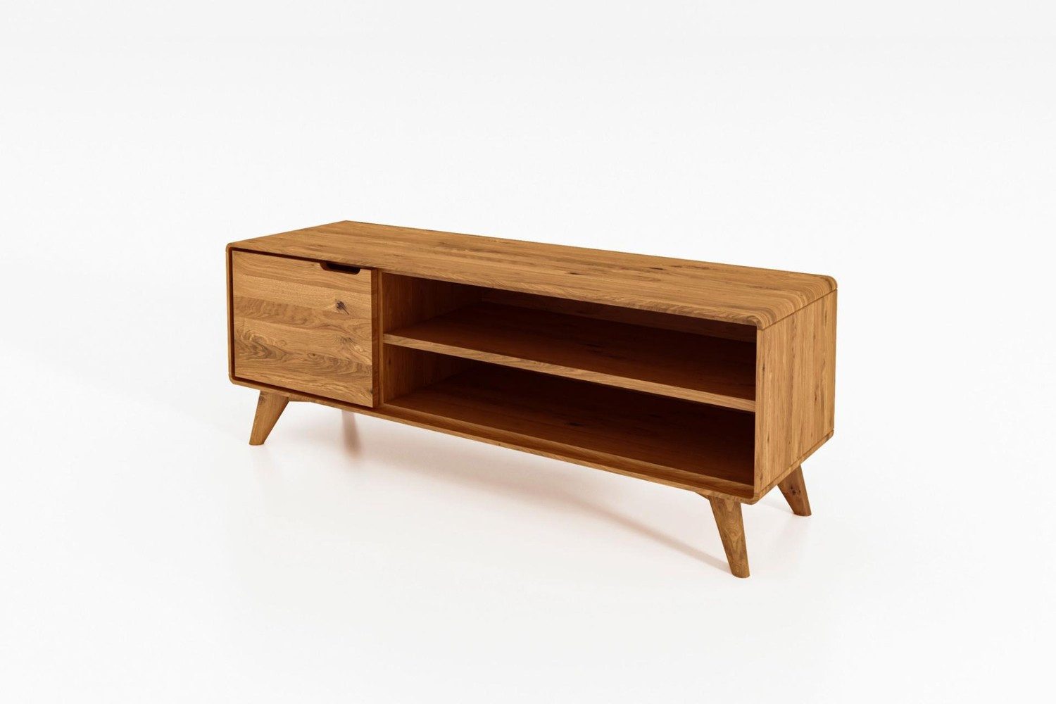 Dieses TV-Board ist ein Highlight hinsichtlich Design und Verarbeitung. Es ist aus massiver geölter Wildeiche gefertigt. Das Lowboard hat eine Tür mit Fingerschachthalterung. Rechts neben der Tür befinden sich noch zwei große offene Fächer. Das TV-Board bietet genug Platz für einen Fernseher oben und diverse andere Utensilien hinter der Tür oder in den offenen Fächern. Ein sehr stylisches Möbelstück für Ihr Wohnzimmer. Passt ideal zu den weiteren Möbeln aus der Gerg-Serie.