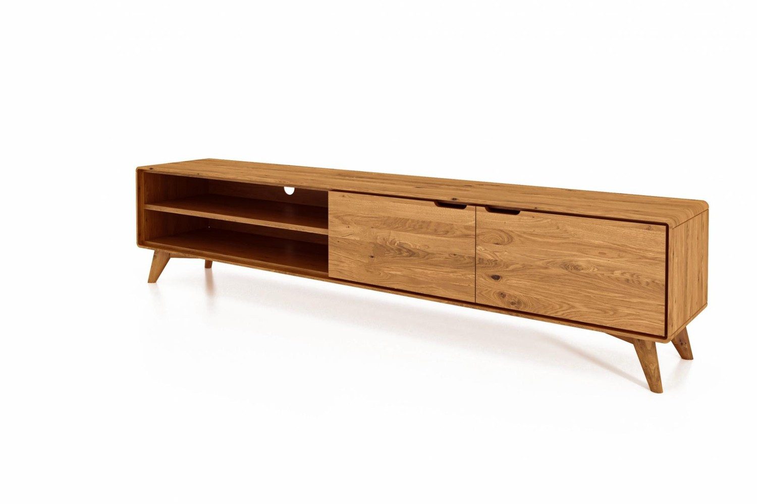 Dieses TV-Board ist ein Highlight hinsichtlich Design und Verarbeitung. Es ist aus massiver geölter Wildeiche gefertigt. Das Lowboard hat zwei Türen mit Fingerschachthalterung. Links neben den Türen befinden sich noch zwei große offene Fächer. Das TV-Board bietet genug Platz für einen Fernseher oben und diverse andere Utensilien hinter den Türen oder in den offenen Fächern. Ein sehr stylisches Möbelstück für Ihr Wohnzimmer. Passt ideal zu den weiteren Möbeln aus der Gerg-Serie.