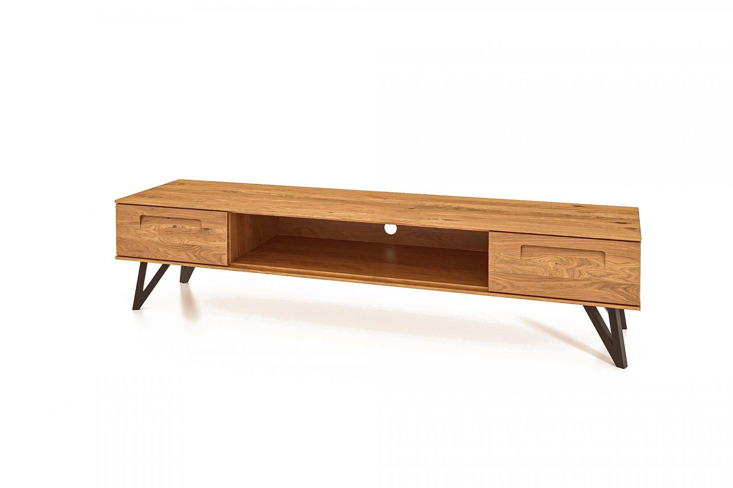 Dieses TV-Board ist ein Highlight hinsichtlich Design und Verarbeitung. Es ist aus massiver geölter Wildeiche gefertigt. Das Lowboard hat zwei Schubladen mit Fingerschachthalterung und Soft Close. Dazwischen befindet sich ein großes offenes Fach. Es steht auf stabilen Designer-Metallbeinen in Schwarz. Das TV-Board bietet genug Platz für einen großen Fernseher oben und allerhand Dinge in den Schubladen, bzw. in dem offenen Fach. Ein sehr stylisches Möbelstück für Ihr Wohnzimmer. Passt ideal zu den weiteren Möbeln aus der Rolo-Serie.