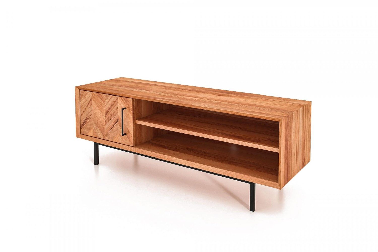 Dieses TV-Board ist ein Highlight hinsichtlich Design und Verarbeitung. Es ist aus zwei cm starker massiver geölter Kernbuche gefertigt. Dieses Lowboard steht auf vier stabilen Metallbeinen in Schwarz. Es hat eine Tür mit schwarzem Metallgriff und rechts neben der Tür zwei große offene Fächer. Hinter der Tür befindet sich auch ein Regalboden. Als optisches Highlight hat die Tür eine Front mit Fischgrätmuster. Das TV-Board bietet oben genug Platz für einen Fernseher und für alle möglichen Dinge hinter der Tür oder in den großen offenen Fächern. Ein sehr stylisches Möbelstück für Ihr Wohnzimmer. Passt ideal zu den weiteren Möbeln aus der Seiba-Serie.