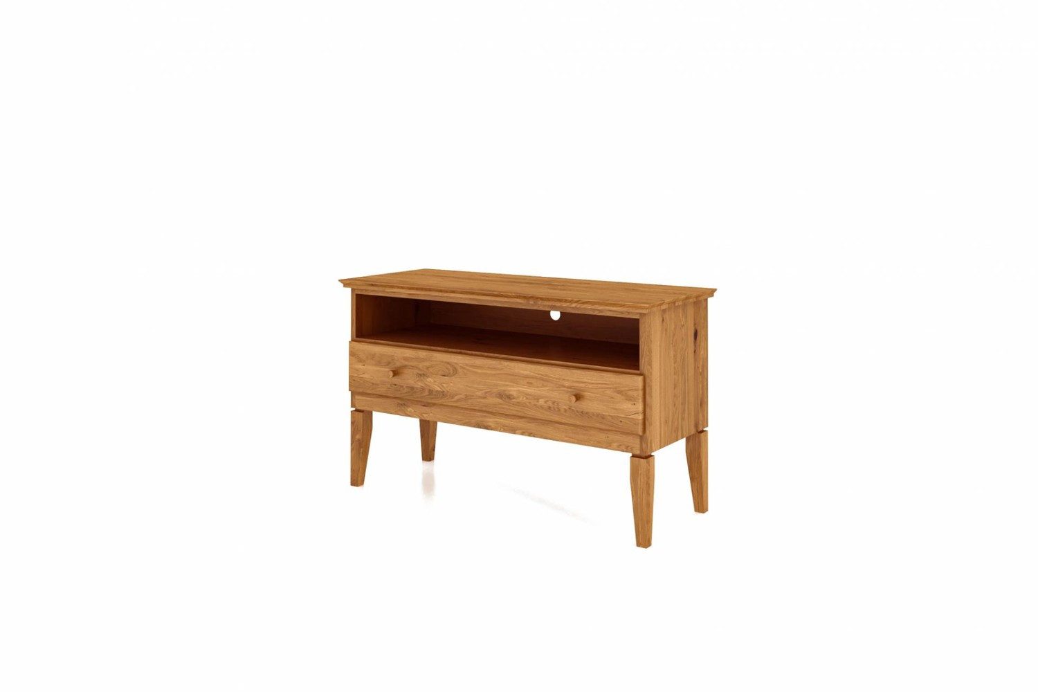 Dieses TV-Board ist ein Highlight hinsichtlich Design und Verarbeitung. Es ist aus 2 cm starker massiver geölter Wildeiche gefertigt. Dieses Lowboard steht auf vier stabilen massiven Holzbeinen. Es hat eine durchgehende Schublade mit Holzgriffen und darüber ein durchgehendes offenes Fach. Die Schublade hat Softclose. Das TV-Board bietet in der Schublade und dem offenen Fach genug Platz zum Ablegen verschiedener Utensilien und oben für einen Fernseher. Ein sehr stylisches Möbelstück für Ihr Wohnzimmer. Passt ideal zu den weiteren Möbeln aus der Sydo-Serie.