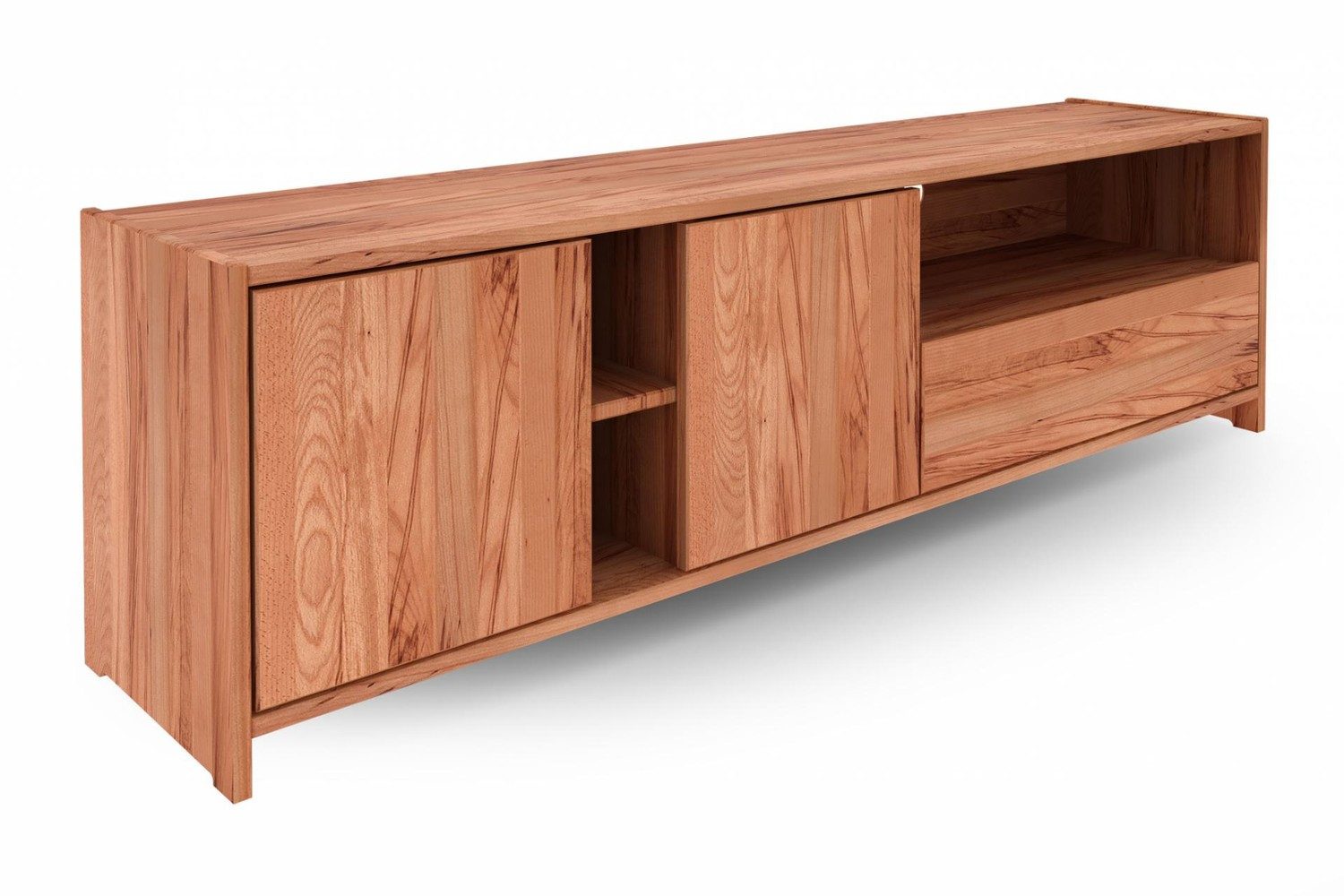 Dieses TV-Board ist ein Highlight hinsichtlich Design und Verarbeitung. Es ist aus massiver geölter Kernbuche gefertigt. Das Lowboard hat in der linken Hälfte zwei Türen mit Soft Close und zwischen den Türen 2 offene Fächer. In der rechten Hälfte gibt es unten eine Schublade und darüber ein offenes Fach. Das TV-Board bietet hinter den Türen ,in der Schublade und in den offenen Fächern genug Stauraum für diverse Utensilien und oben auch noch reichlich Platz für einen großen Fernseher. Ein sehr stylisches Möbelstück für Ihr Wohnzimmer. Passt ideal zu den weiteren Möbeln aus der Zigo-Serie.