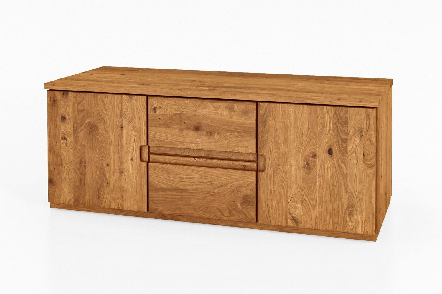 Diese Kommode ist ein Highlight hinsichtlich Design und Verarbeitung. Sie ist aus massiver geölter Wildeiche gefertigt. Das Sideboard hat links und rechts je eine Tür mit Fingerschachthalterung. Hinter jeder Tür befindet sich auch ein Regalboden. In der Mitte zwischen den Türen gibt es auch noch zwei Schubladen mit Fingerschachthalterung und Soft Close. Es steht stabil flach auf dem Boden. Die Kommode bietet hinter den Türen und in den Schubladen genug Stauraum für diverse Utensilien und oben auch noch reichlich Platz für Dekoration. Ein sehr stylisches Möbelstück für Ihr Schlafzimmer oder Wohnzimmer. Passt ideal zu den weiteren Möbeln aus der Bento-Serie.