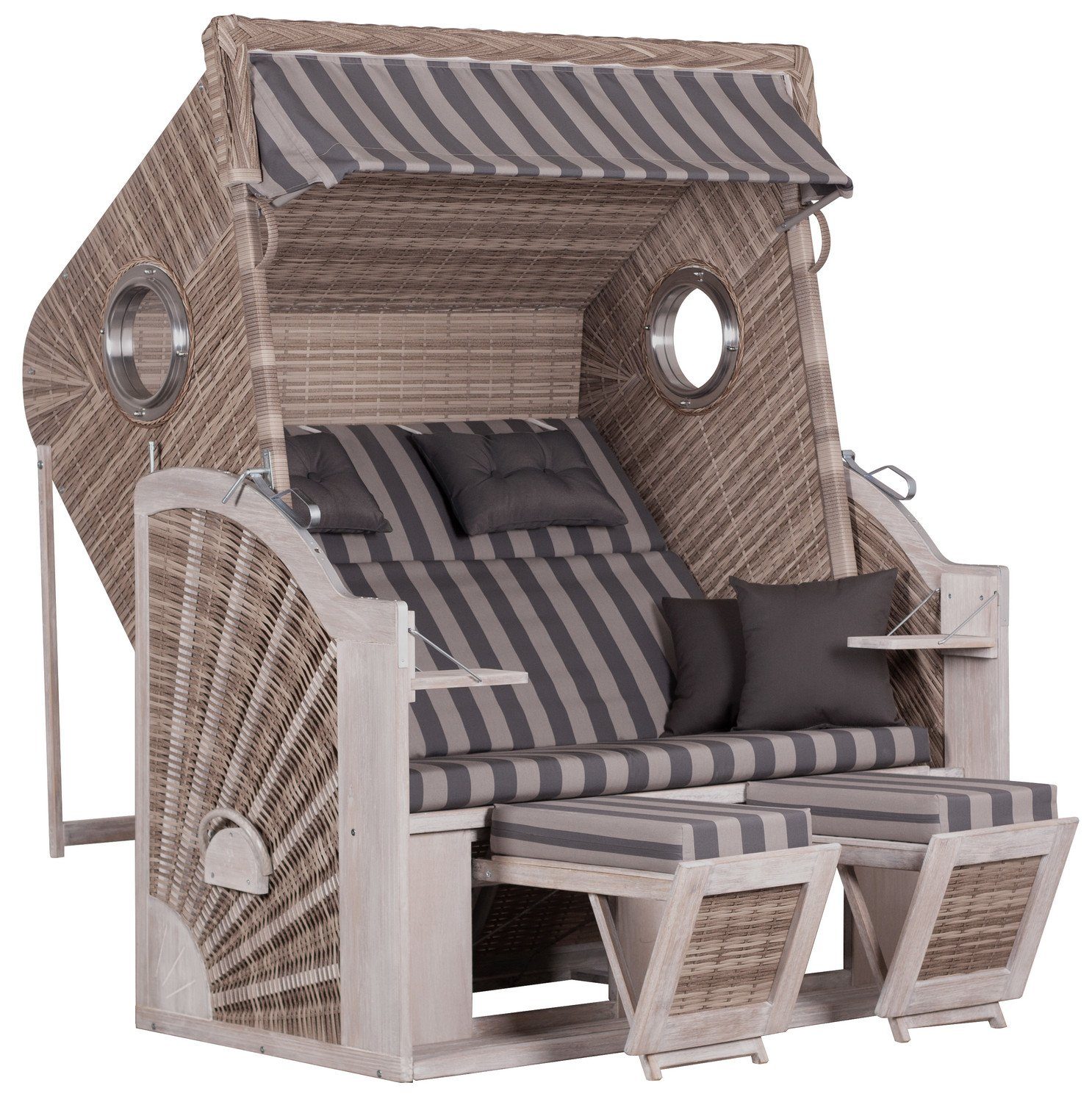 Mit diesem einzigartigen Strandkorb bleiben keine Wünsche mehr offen! Das helle Pinienholz hat ein Ice-Flower-Finish, wodurch der Strandkorb diesen wunderschönen Look erhält. Ein weiteres besonderes Merkmal dieses Strandkorbs ist der innen und außen durchgeflochtene Oberkorb mit durchsichtiger, eingearbeiteter Windschutzfolie, welchen es so kein zweites Mal gibt. Zudem lässt sich der Oberkorb mehrfach verstellen, dadurch haben Sie immer die optimale Sitzposition. Die verstellbaren Nackenkissen, die höhenverstellbaren und gepolsterten Fußstützen und die extra Wurfkissen sorgen für den perfekten Entspannungsgenuss. Zwei Klapptische auf den Seiten bieten genügend Platz für persönliche Gegenstände. Die Bullaugen aus Aluminium runden den hochwertigen Strandkorb perfekt ab und verleihen ihm einen maritimen Charme.