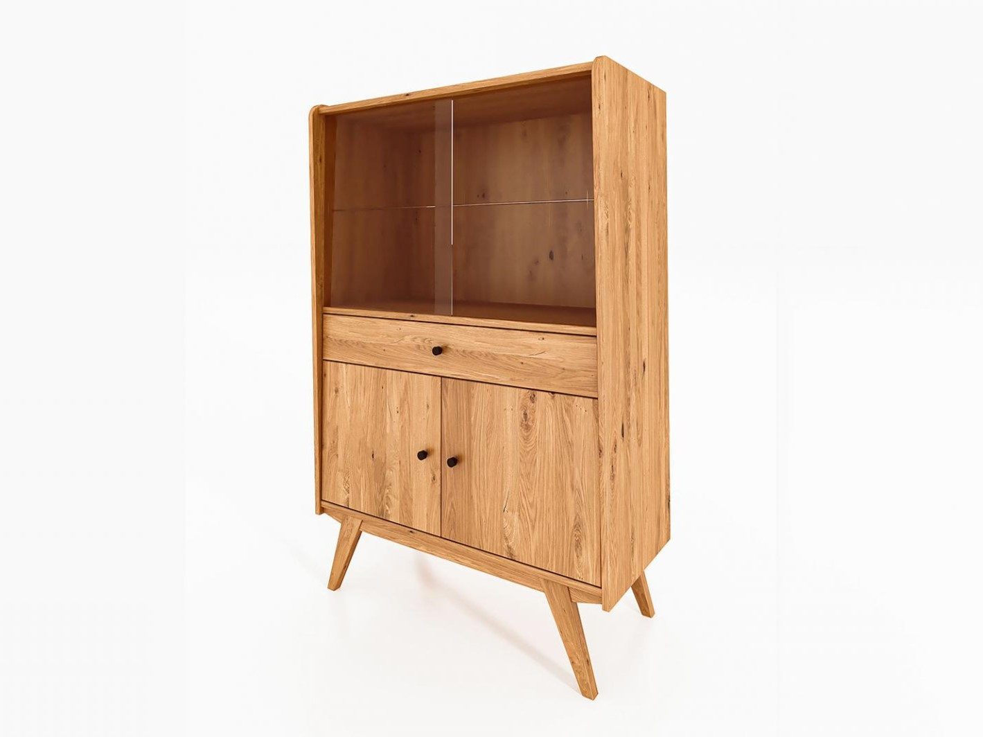 Sie möchten eine massive Vitrine welche durch ihre Optik und Robustheit besticht ? Dann kann dieses Highboard genau das Richtige für Sie sein. Es ist aus massiver geölter Wildeiche gefertigt und hat zwei Türen mit schwarzen Griffen aus Aluminium. Über den Türen befindet sich eine große Schublade, ebenfalls mit einem Griff aus schwarzem Aluminium. Die Schublade hat Softclose und ist mit schwarzem Samt ausgelegt. Darüber ein großes offenes Fach mit zwei Glasschiebetüren und einem Glasboden dahinter. Die Vitrine steht auf vier stabilen massiven schrägen Holzbeinen. Dieses Highboard bietet genug Stauraum für alle möglichen Utensilien. Auf jeden Fall ein Highlight für jedes Wohnzimmer oder Esszimmer. Passt ideal zu den weiteren Möbeln aus der Jetro-Serie.