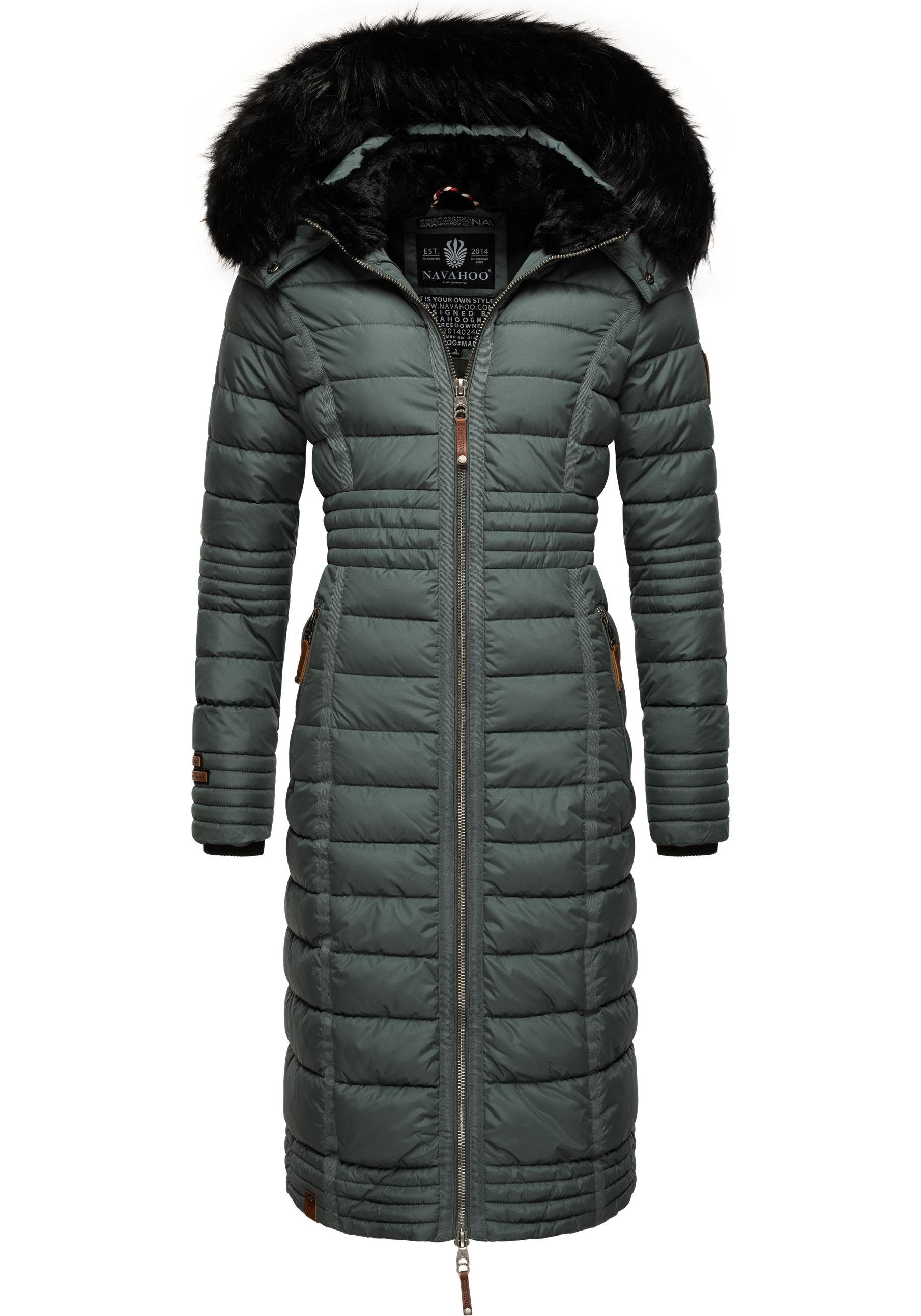 Besondere Merkmale | langer Damen Winter Steppmantel mit Kunstfellkapuze |