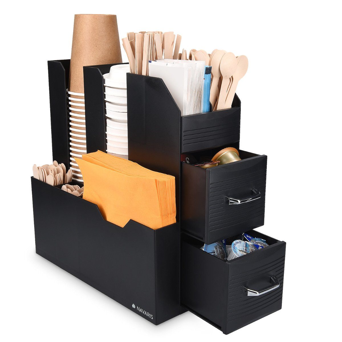 DER PERFEKTE KÜCHENORGANIZER Lust auf einen frischen Kaffee? Mit Hilfe des Behälters sparst Du Dir langes Zusammensuchen der richtigen Utensilien. Hier sind Zucker, Becher, Rührstäbchen, Servietten, Sahne oder Kaffeekapseln an einem Ort. FÜR BÜRO ODER PAUSENRAUM Der Organizer findet in fast jedem Raum einen passenden Platz und ist optimal für eine einfache Zubereitung von Kaffee, Latte Macchiato oder Cappuccino. MODERNES DESIGN Das schlichte aber praktische Design passt gut in jede Art von Einrichtung. Dank verschiedener Fächer kannst Du alle wichtigen Bestandteile eines guten Kaffees schnell sortieren. WEITERE NUTZUNGSMÖGLICHKEITEN Auch Zubehör für Tee oder heiße Schokolade kann hier organisiert werden. Die praktischen Fächer bieten Platz für verschiedene Aromen oder Liköre. GUT ZU WISSEN Die Kaffeeecke kann nach Gebrauch leicht gereinigt werden. Zubehör zum Befüllen der Box ist in der Lieferung nicht enthalten.