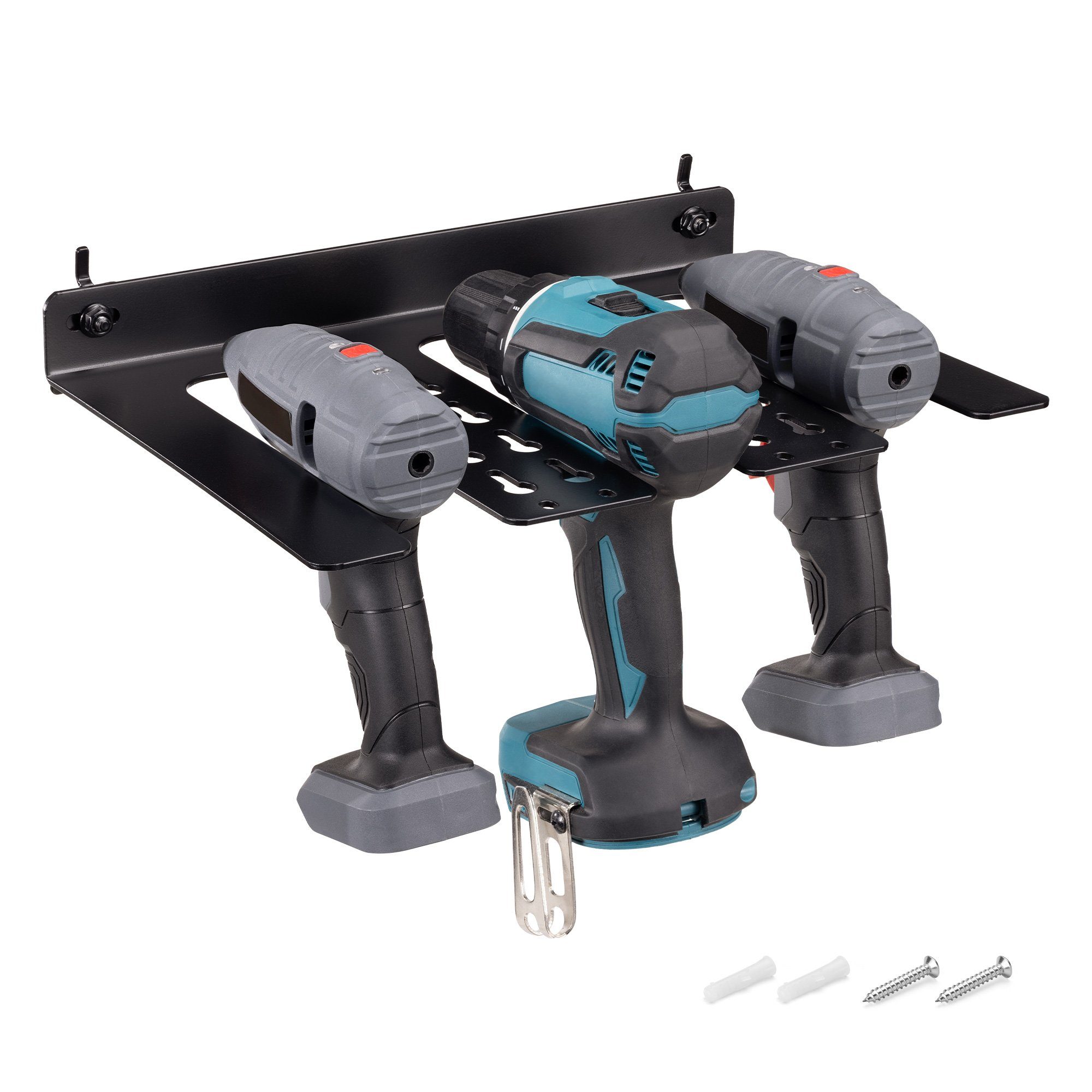 DETAILS: 1x Bohrmaschonenhalterung, 1x Ablage, 4x Lochwandbefestigung, 4x Schrauben und Dübel für die Wandbefestigung / Material: Stahl / Maße: 31,5x21,5x4,5 cm / Gewicht: 1,1 kg