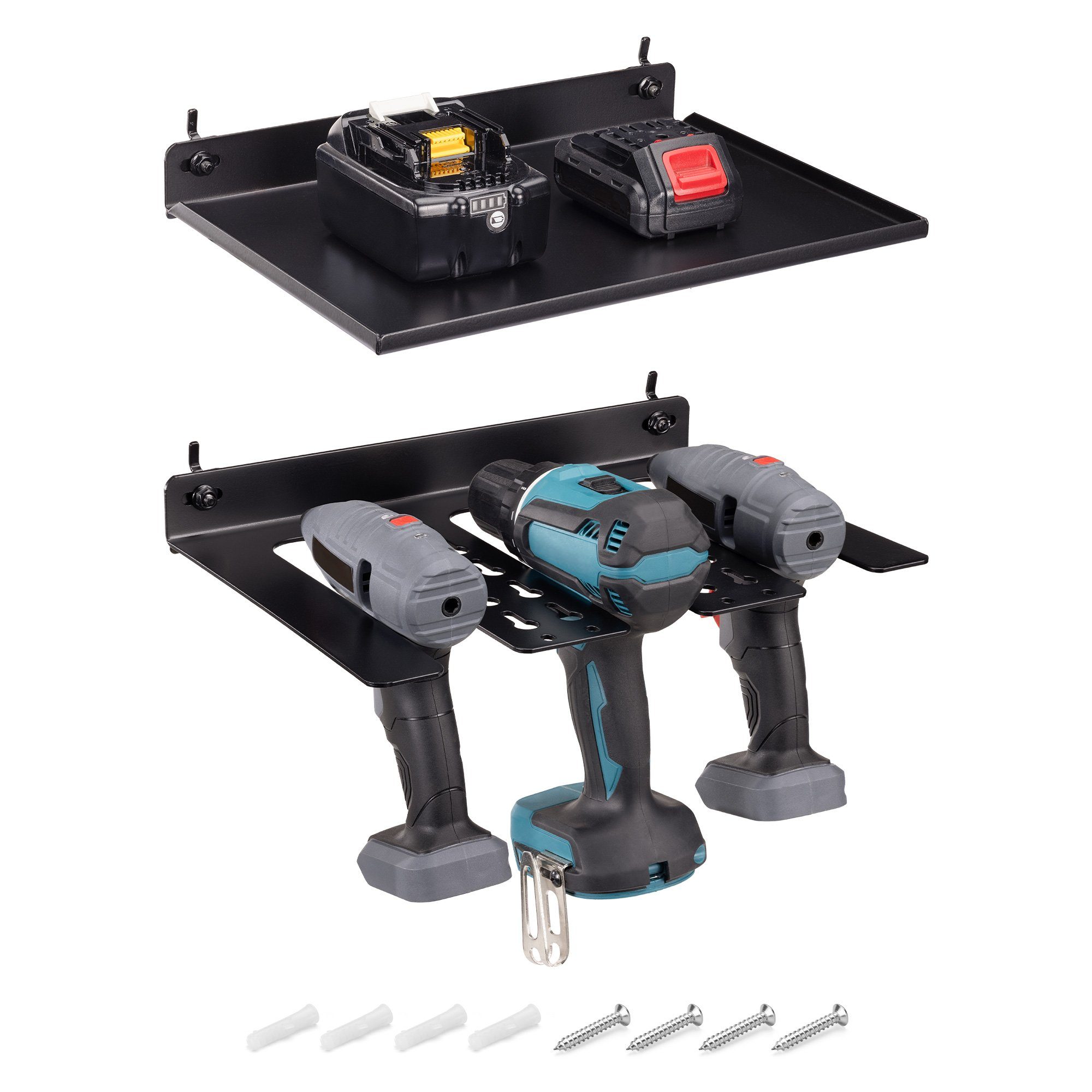 DETAILS: 1x Bohrmaschonenhalterung, 1x Ablage, 4x Lochwandbefestigung, 4x Schrauben und Dübel für die Wandbefestigung / Material: Stahl