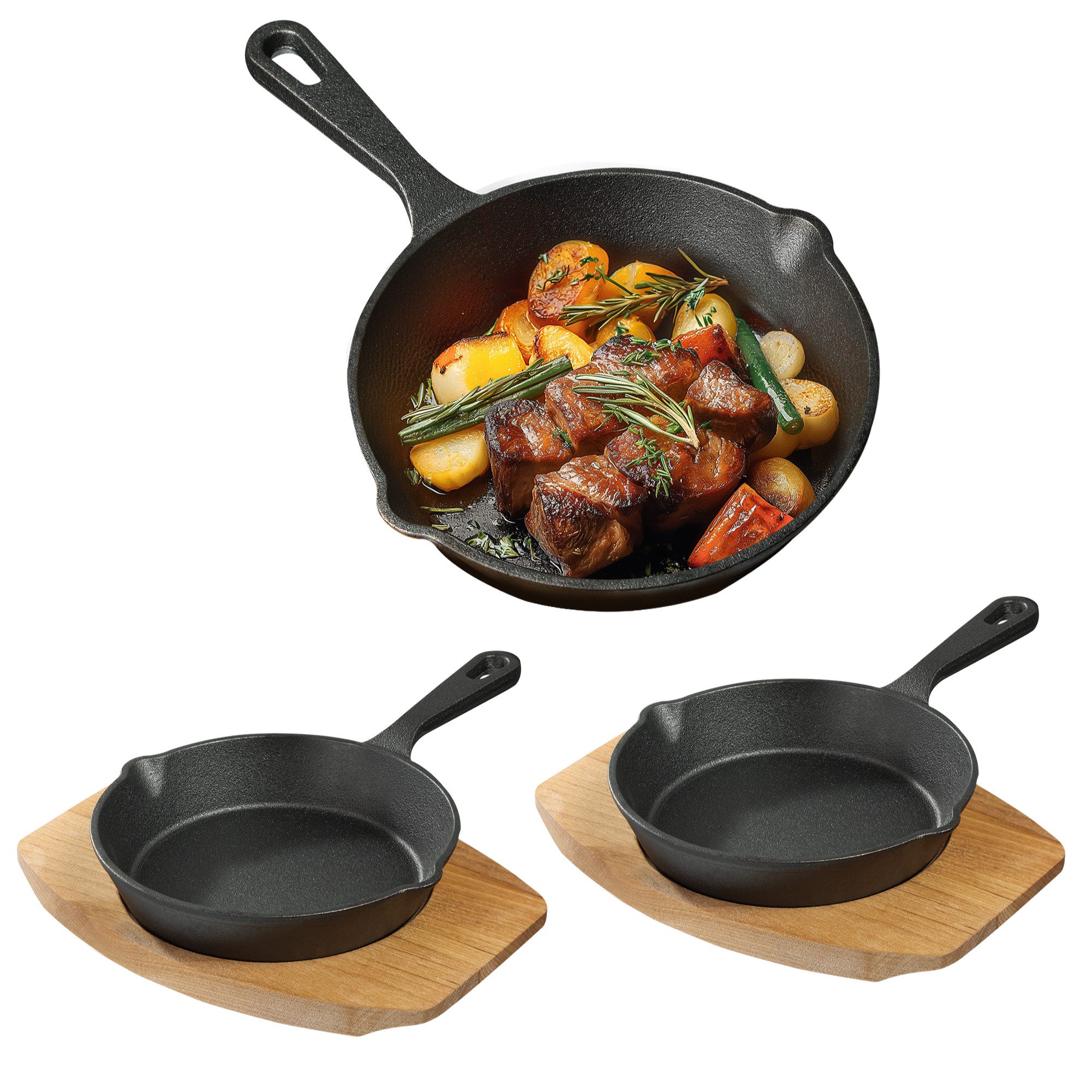 DEIN NEUER KÜCHENSTAR – 2ER SET GUSSEISERNE PFANNE MIT HOLZUNTERSETZER
