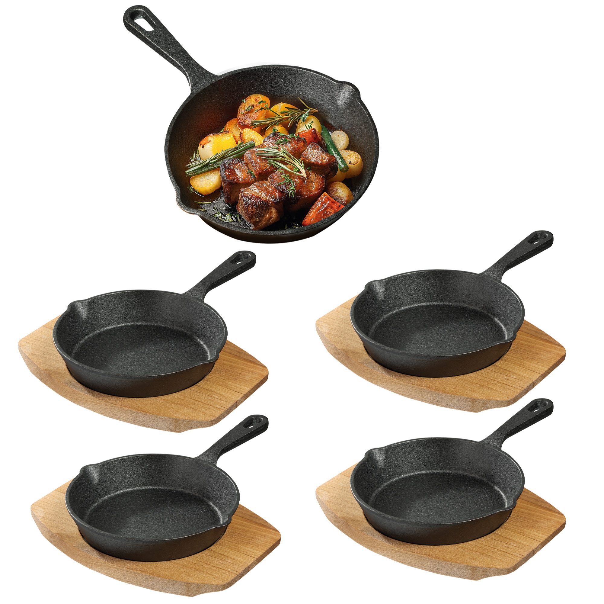 DEIN NEUER KÜCHENSTAR – 4ER SET GUSSEISERNE PFANNE MIT HOLZUNTERSETZER