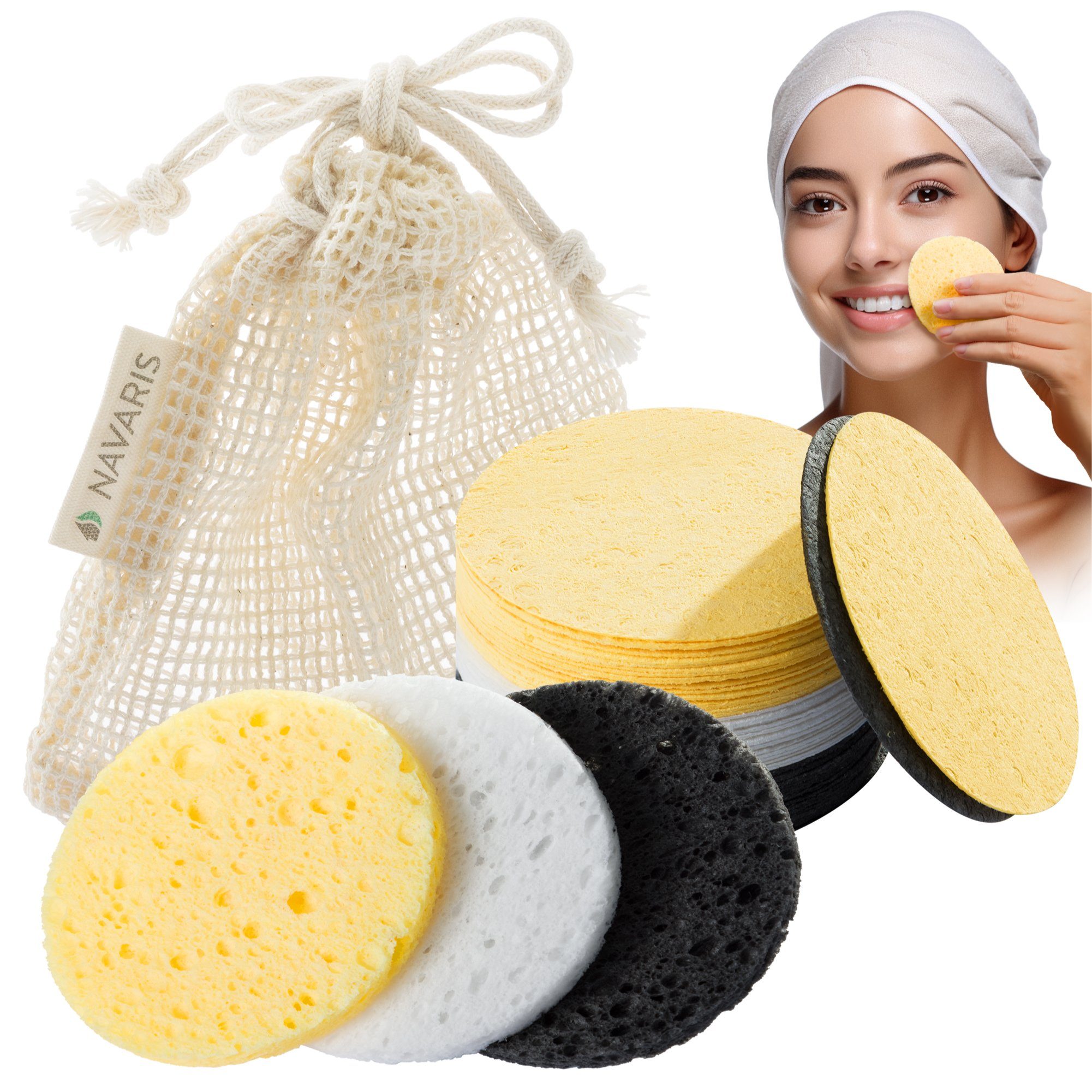 In jeder Packung erhältst du 50 biologisch abbaubare Gesichtsschwämme. Diese kommen in drei Farben (schwarz, gelb, weiß) und sind bis zu einer Woche lang wiederverwendbar. Somit schonst du deinen Geldbeutel und die Umwelt.