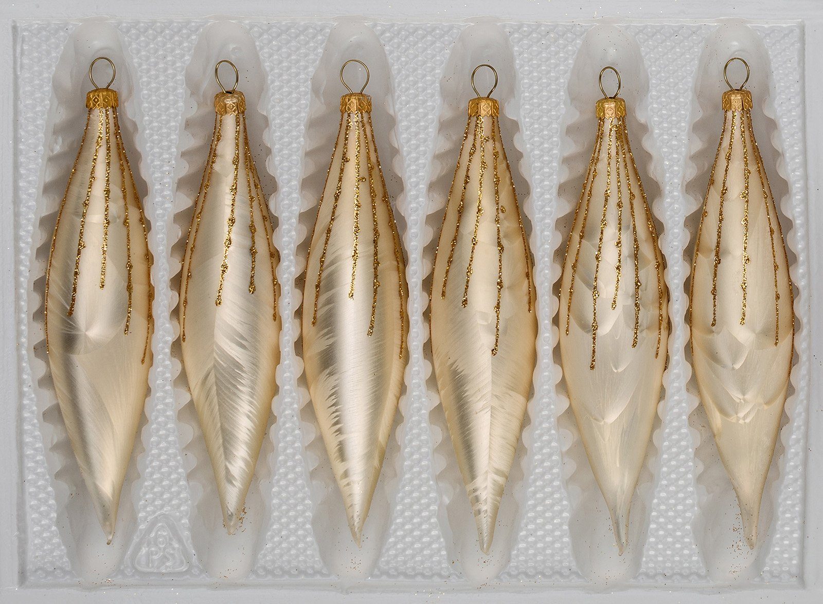 6 tlg. Glas Zapfen Set in "Ice Champagner Gold" Regen Jeder einzelne Zapfen wurde mit viel Mühe und Geduld von Hand gefertigt. Mundgeblasen und edel verziert. Das gesamte Dekor kann man nicht in Worte fassen. Schauen Sie sich einfach die Bilder an und tauchen Sie in einem wunderschönen Weihnachtsflair ein. Wir haben noch weiteren Weihnachtsbaumschmuck in dem das selbe Dekor enthalten ist oder stellen Sie sich doch einfach was schönes zusammen. Zu diesem Set haben wir auch passende Glas-Vögel mit echten Federn, 12tlg. Set´s und 39tlg. Set´s