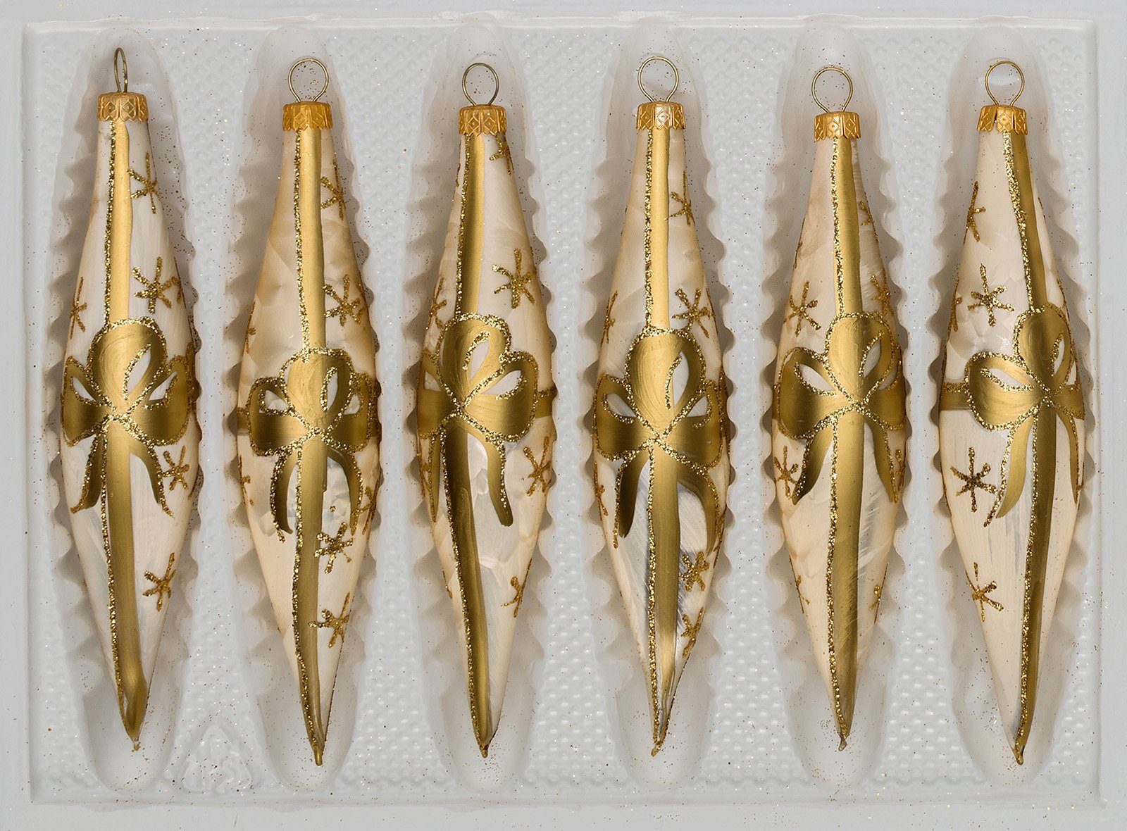 Christbaumschmuck 6 tlg. Glas-Zapfen Set in Ice Champagner Goldene Schleife