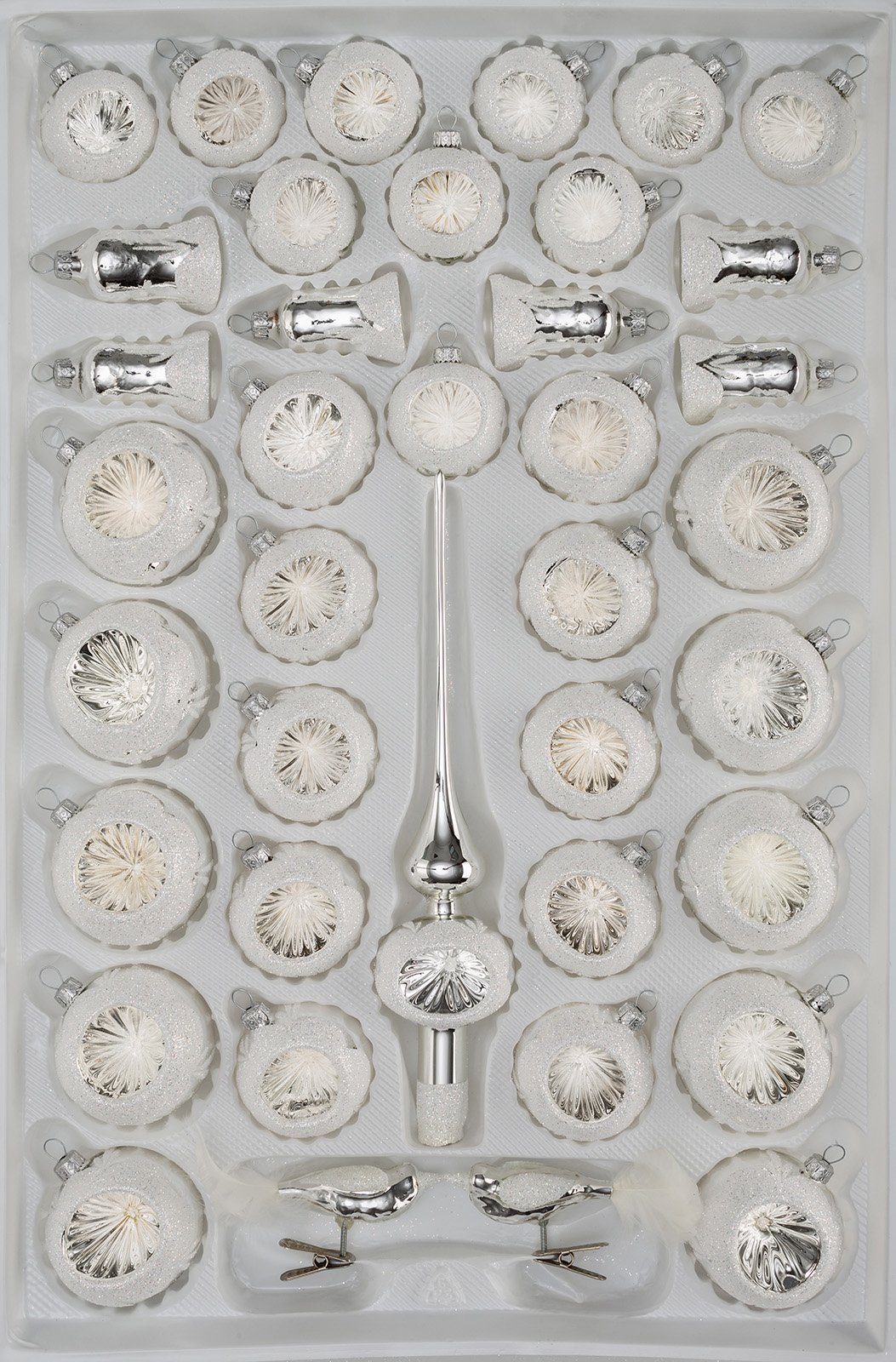 39 tlg. Weihnachtskugeln Set in "Hochglanz Vintage Silver" Der absolute Klassiker zu Weihnachten. Jede einzelne Kugel wurde mit viel Mühe und Geduld von Hand gefertigt. Mundgeblasen und edel verziert. Das gesamte Dekor kann man nicht in Worte fassen. Schauen Sie sich einfach die Bilder an und tauchen Sie in einem wunderschönen Weihnachtsflair ein. Wir haben noch weiteren Weihnachtsbaumschmuck in dem das selbe Dekor enthalten ist oder stellen Sie sich doch einfach was schönes zusammen. Der Durchmesser der einzelnen Kugeln beträgt ca. 4-8cm Zu diesem Set haben wir auch passende Glas-Vögel mit echten Federn, Glas Zapfen & 12tlg. Set´s Bestellen Sie doch gleich die Weihnachtskugel-Haken mit!