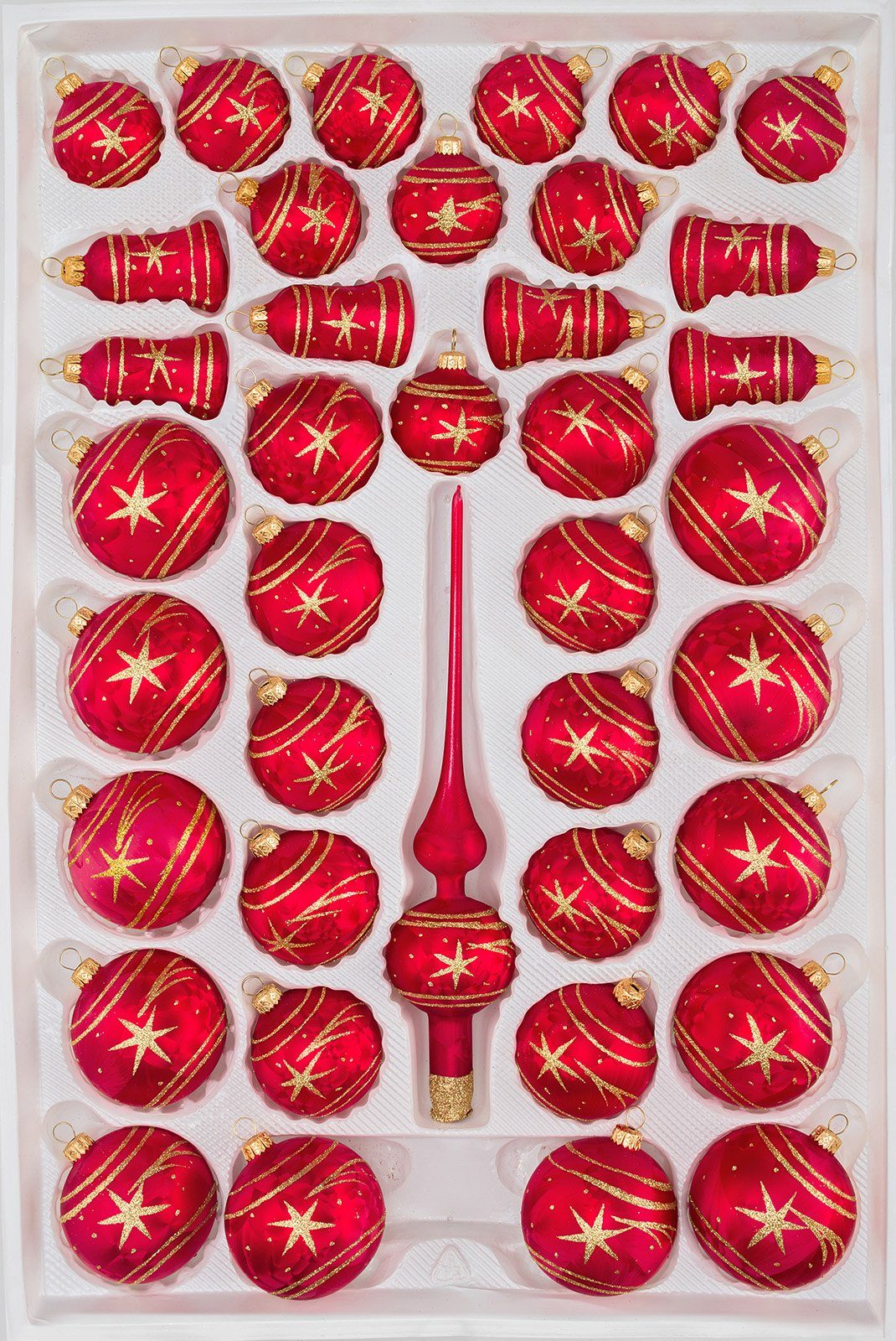 39 tlg. Glas-Weihnachtskugeln Set in "Ice Rot Gold" Komet Jede einzelne Kugel wurde mit viel Mühe und Geduld von Hand gefertigt. Mundgeblasen und edel verziert. Das gesamte Dekor kann man nicht in Worte fassen. Schauen Sie sich einfach die Bilder an und tauchen Sie in einem wunderschönen Weihnachtsflair ein. Wir haben noch weiteren Weihnachtsbaumschmuck in dem das selbe Dekor enthalten ist oder stellen Sie sich doch einfach was schönes zusammen. Der Durchmesser der einzelnen Kugeln beträgt ca. 4-8cm Zu diesem Set haben wir auch passende Glas-Vögel mit echten Federn, Glas Zapfen & 12tlg. Set´s Bestellen Sie doch gleich die Weihnachtskugel-Haken mit!