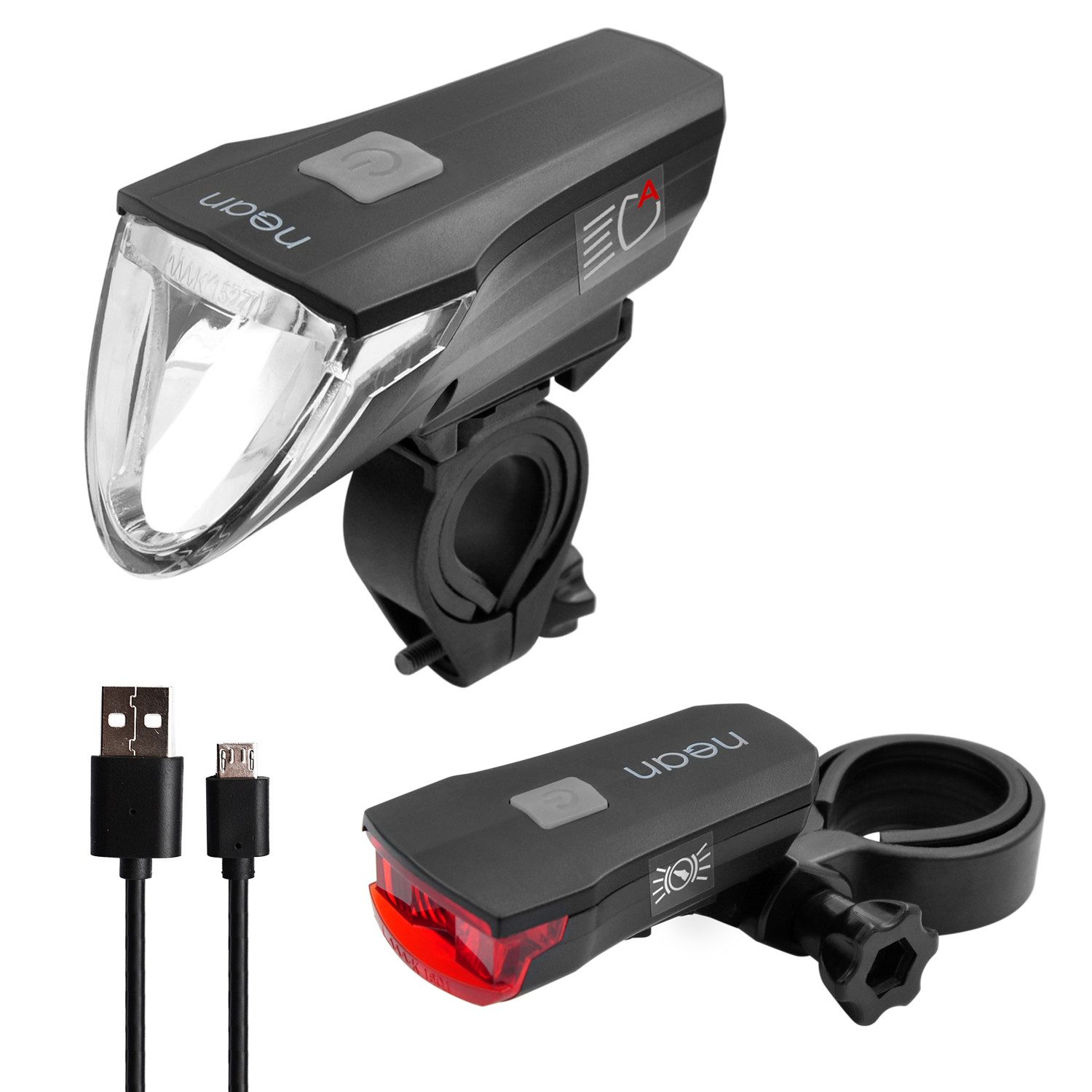 Lieferumfang | 1 Frontleuchte 1 Rückleuchte 1x Bedienungsanleitung 2x Ladekabel 2xSchraubriemenhalterung 5 Haftstreifen |