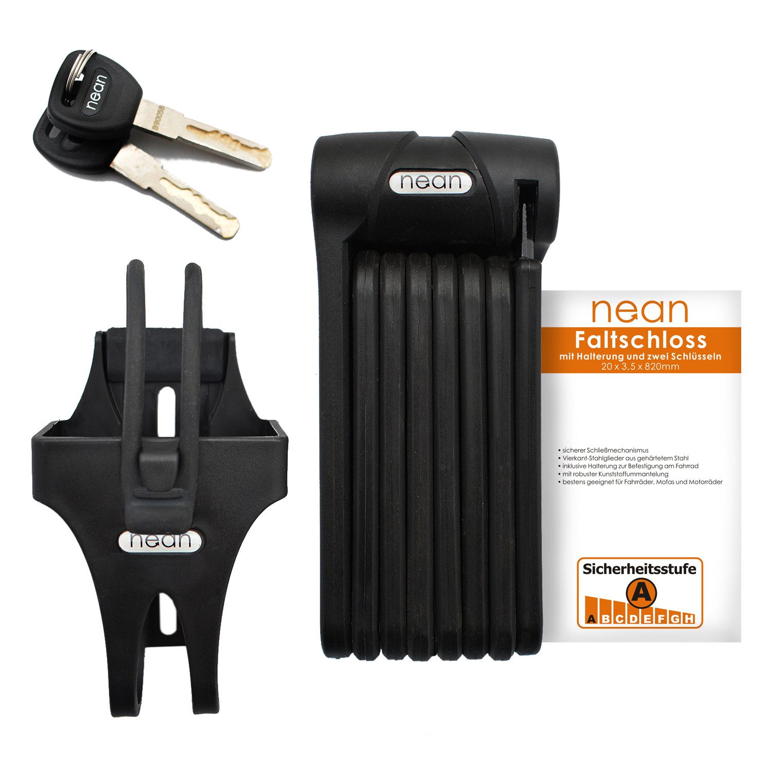 Lieferumfang | 1 Faltschloss 1 Stecktasche 1 Kunststoffgurt 2 Sicherheitswendeschlüssel 1 Madenschraube Sechskantschlüssel |