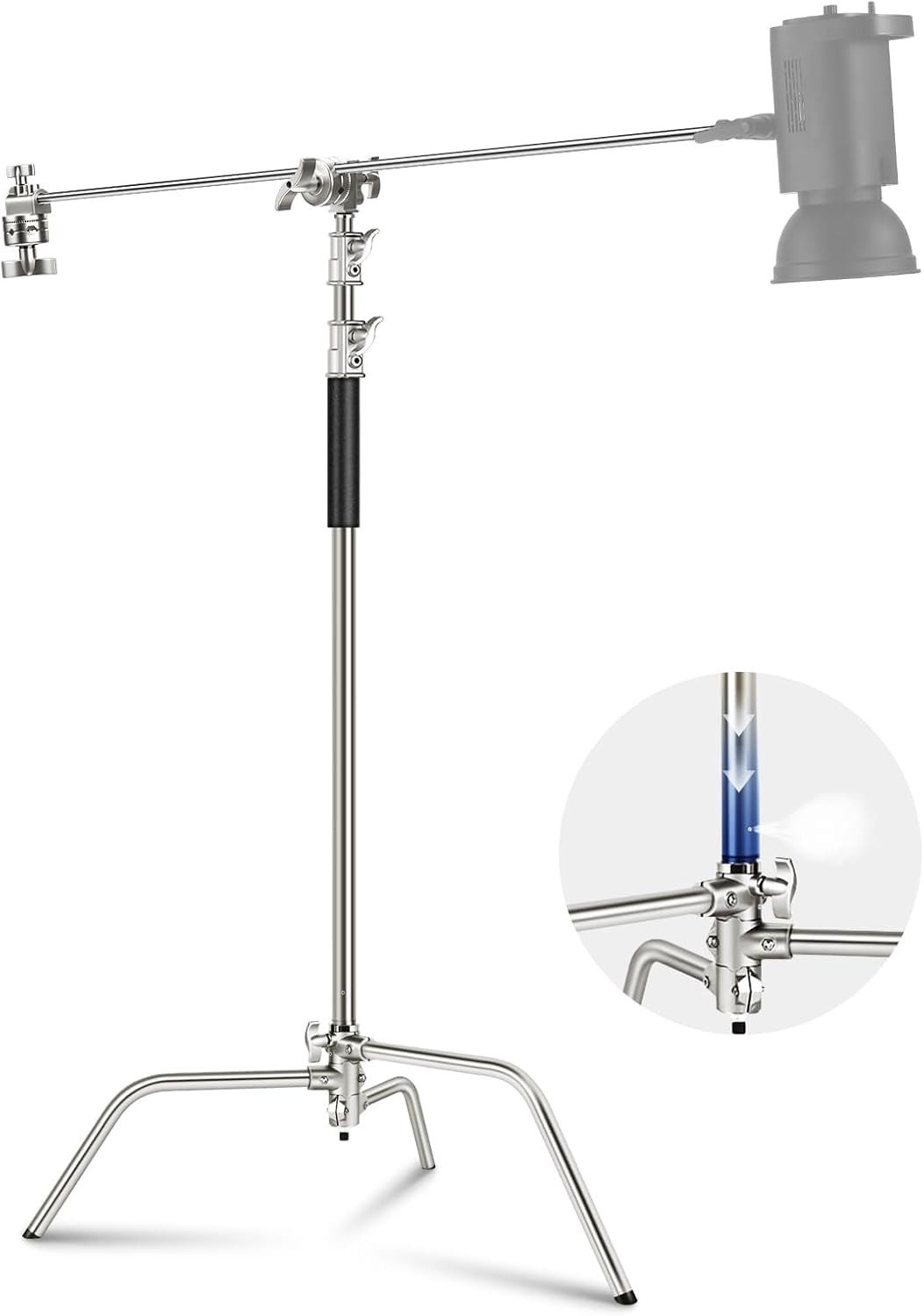 Aus 100% professionellem Edelstahl gefertigt, um Korrosion und Feuchtigkeit zu widerstehen und eine lange Lebensdauer für Studio- und der Fotografie im Freien zu bieten,dies macht diesen C Ständer zu einem robusten und zuverlässigen Ständer zur Stabilisierung Ihrer Fotoausrüstung und Ihres Zubehörs wie Reflektoren, Softboxen, Monolichter und Blitzlichter. Die interne Luftkissenstruktur kann die Auswirkungen eines plötzlichen Sturzes reduzieren.