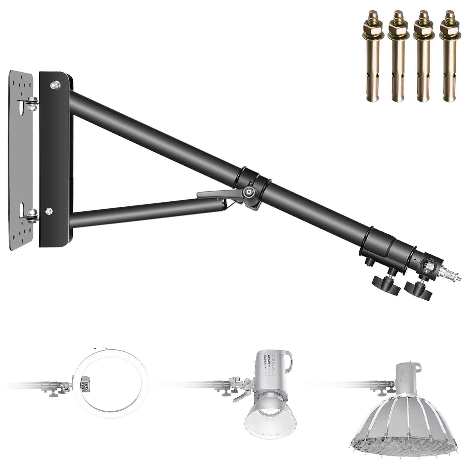 Dieser Wandmontageauslegerarm ist perfekt für die Unterstützung von Fotoausrüstung wie Studio-Videoblitzleuchten, Monolights, Softboxen, Schirmen und Reflektoren.