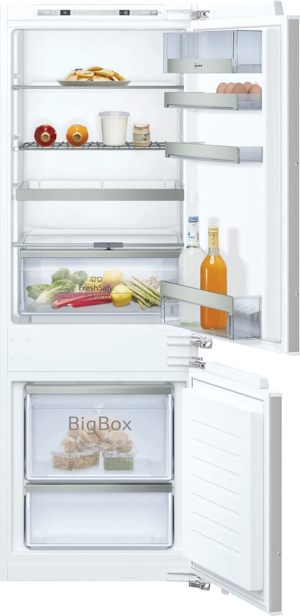 Die Einbaukühlgefrierkombination »KI6773FE1« ist von der Marke NEFF und integrierbar. Das Modell bietet ausreichend Platz für deinen Einkauf durch seine Maße von 55,8 x 157,8 x 54,5 cm (B/H/T) und das Gefriervolumen von 62 l und Kühlvolumen von 169 l. Das Betriebsgeräusch des Modells liegt bei 36 dB. Eisbildung wird durch die LowFrost-Technologie vermindert – so bildet sich erheblich weniger Eis als bei herkömmlichen Geräten. Das Abtauen gelingt daher deutlich schneller und verbraucht dabei weniger Strom. Zwei Gefrierschubladen, eine Gemüseschublade und eine BigBox stehen zur Verfügung, um die Lebensmittel zu verstauen. Das TouchControl-Display zeigt eine komfortable Bedienung. Die vier Ablageflächen, darunter drei höhenverstellbar, bieten viel Platz für Lebensmittel. Für optimale Übersichtlichkeit ist das Modell mit einer ausziehbaren EasyAccess-Platte ausgestattet. Die vier Türablagen ermöglichen eine übersichtliche Aufbewahrung. Besonders schnell kühlen und einfrieren lassen sich Nahrungsmittel durch die SuperCooling-Funktion. Bei offen stehender Tür meldet dies die Einbaukühlgefrierkombination mit einem akustischen Warnsignal. Dank der LED-Innenbeleuchtung findet man sofort, wonach man sucht. Die »KI6773FE1« von NEFF ist eine Einbaukühlgefrierkombination, die mit ihren Features überzeugt und ausreichend Platz für Nahrungsmittel aller Art bietet.