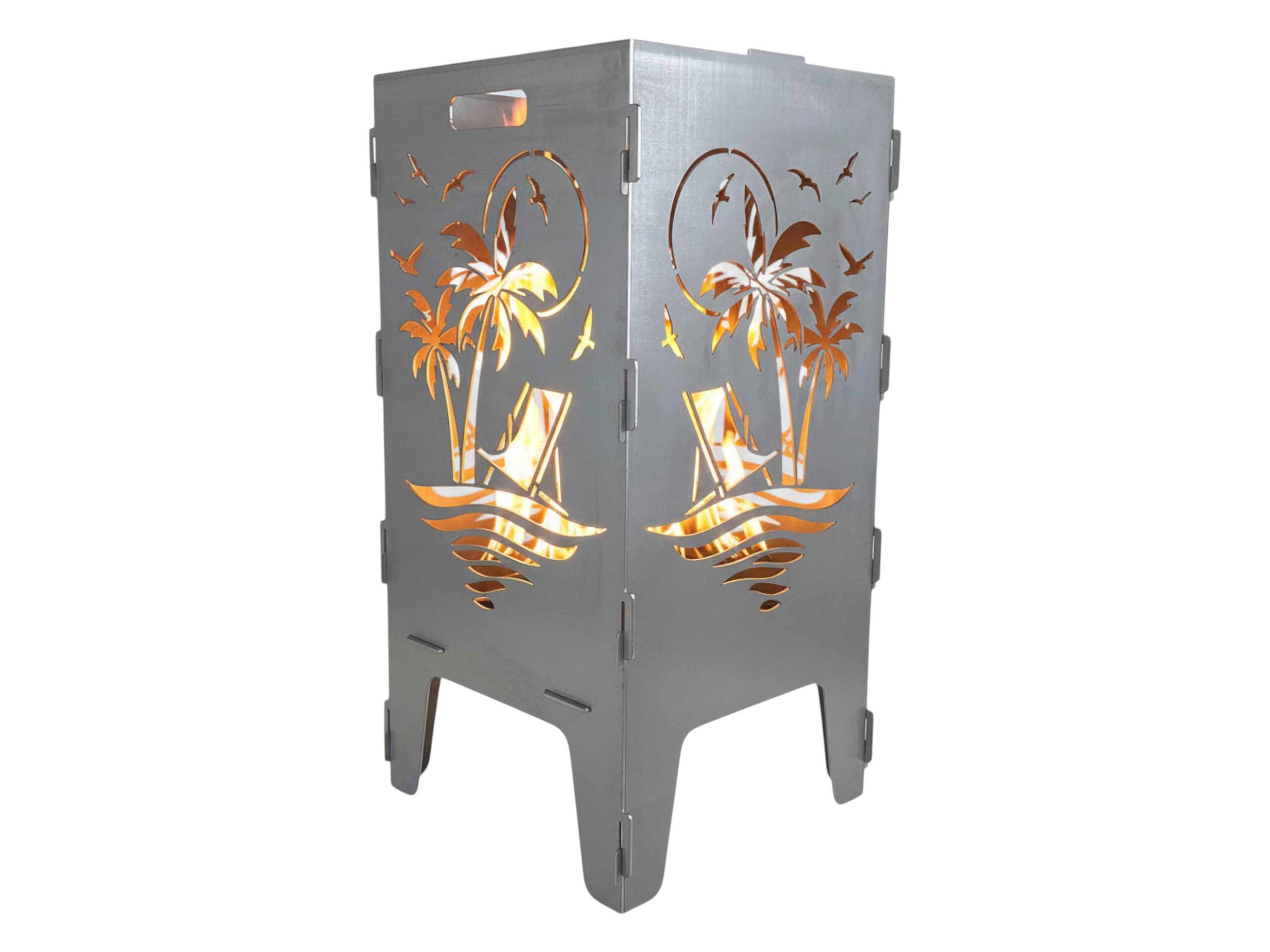 Urlaubsfeeling für Zuhause: Dieser Feuerkorb mit Palmen, Liegestuhl und Möwen bringt tropisches Flair in Deinen Garten. Das stimmungsvolle Motiv leuchtet im Feuerschein und lädt zum Träumen von Sonne, Strand und Meer ein.