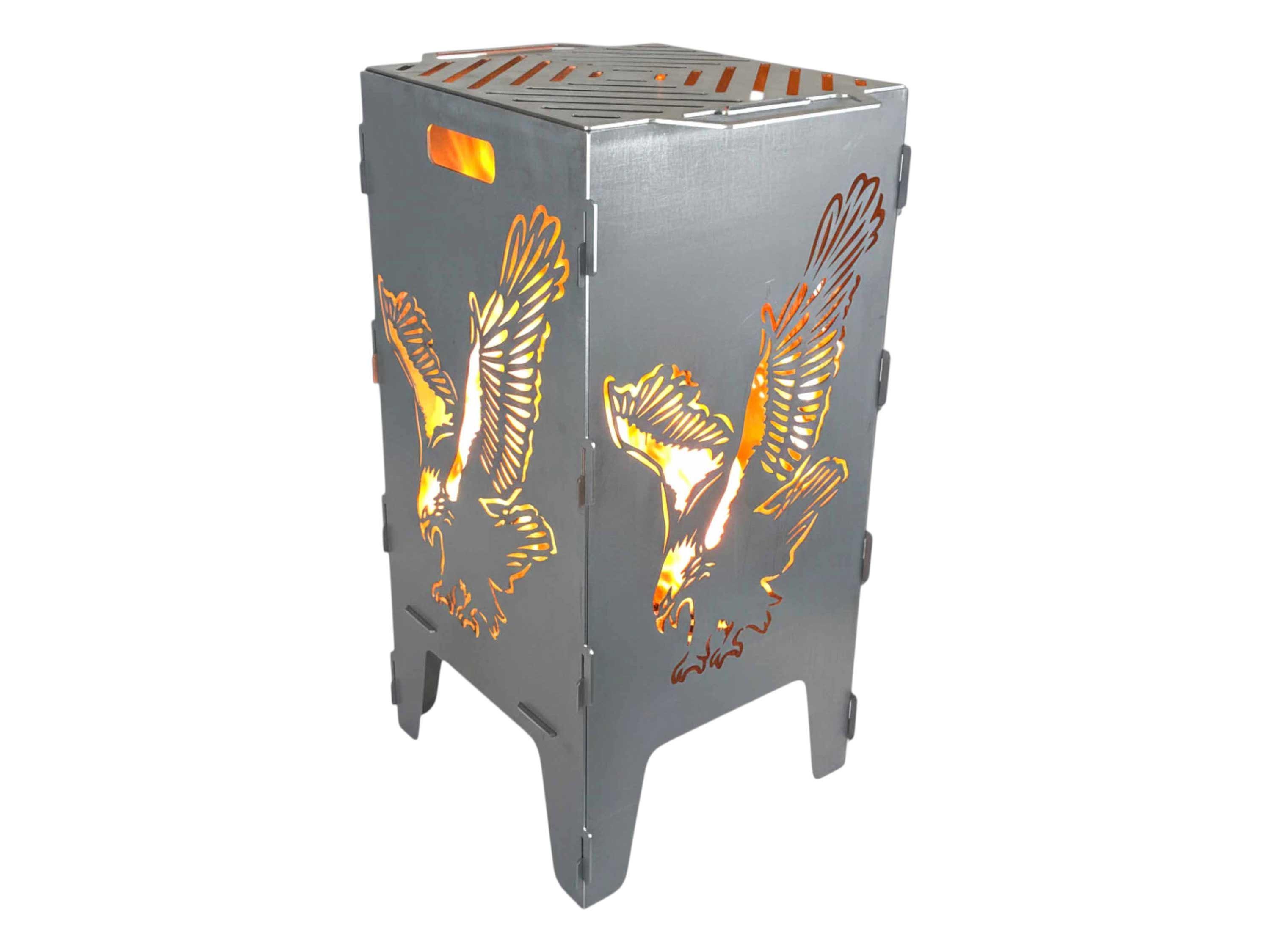 Dieser hochwertige Feuerkorb aus 3 mm dickem Stahl ist ein echter Blickfang für Deinen Außenbereich. Das ausgeschnittene Adler-Motiv an allen vier Seiten verleiht dem Feuerkorb eine beeindruckende Optik – besonders bei Dunkelheit, wenn das Feuer lodert.