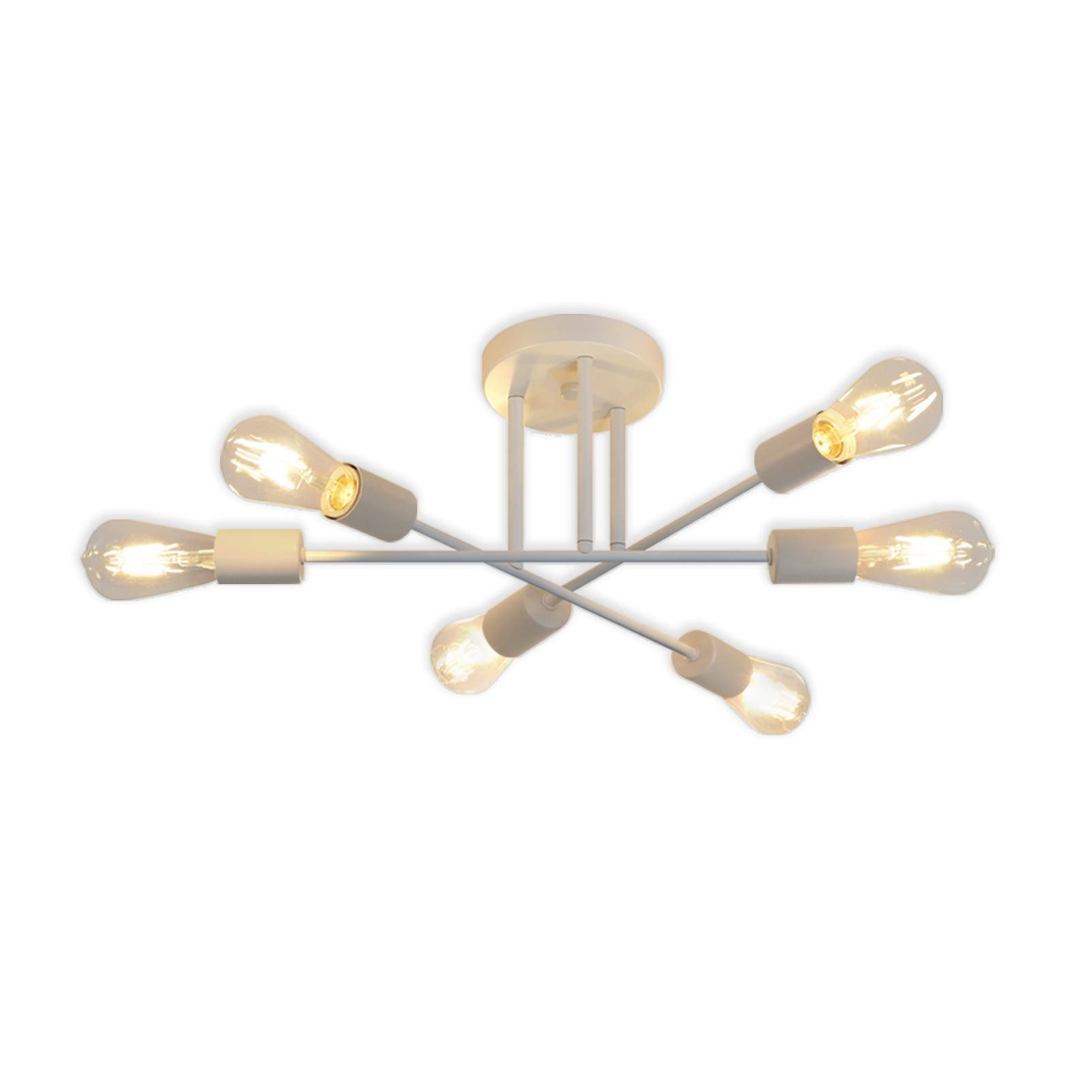 Die Deckenlampe begeistert mit sechs Leuchten, die allesamt in unterschiedliche Richtungen zeigen und den Raum somit optimal mit ihrem Licht füllen. Mehrere Stäbe verbinden die Leuchtmittel mit der weißen Basis, die senkrecht im Raum schwebt.