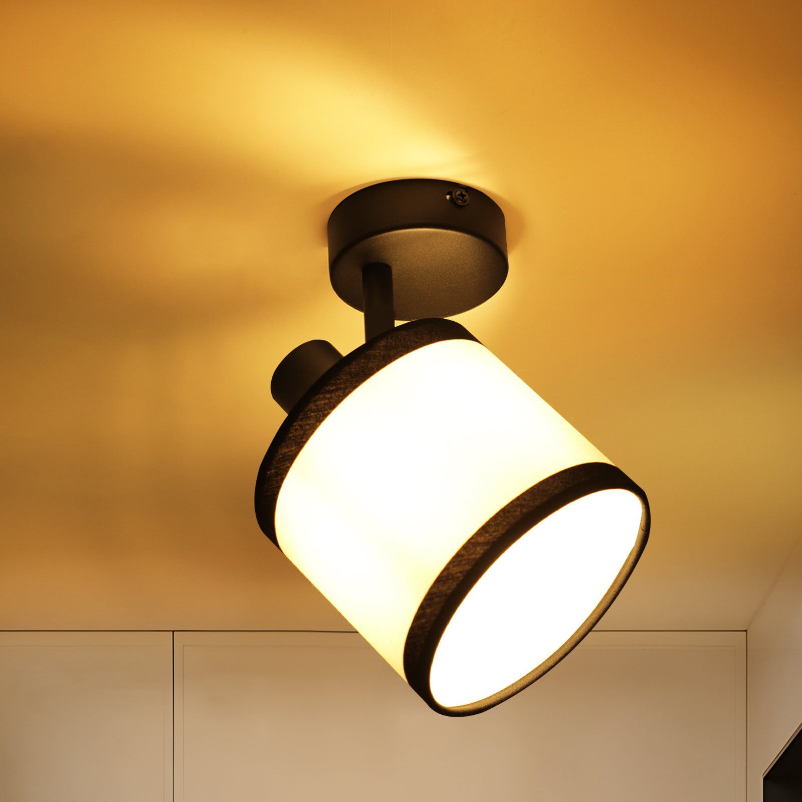 Weiches Licht & Elegante Optik: Der hochwertige Stoffschirm streut das Licht sanft und sorgt für eine warme, einladende Atmosphäre. In Kombination mit der klassischen schwarz-weißen Farbgebung wird die deckenstrahler 1 flammig zu einem stilvollen Dekorations-Element, das jedem Raum eine elegante Note verleiht.