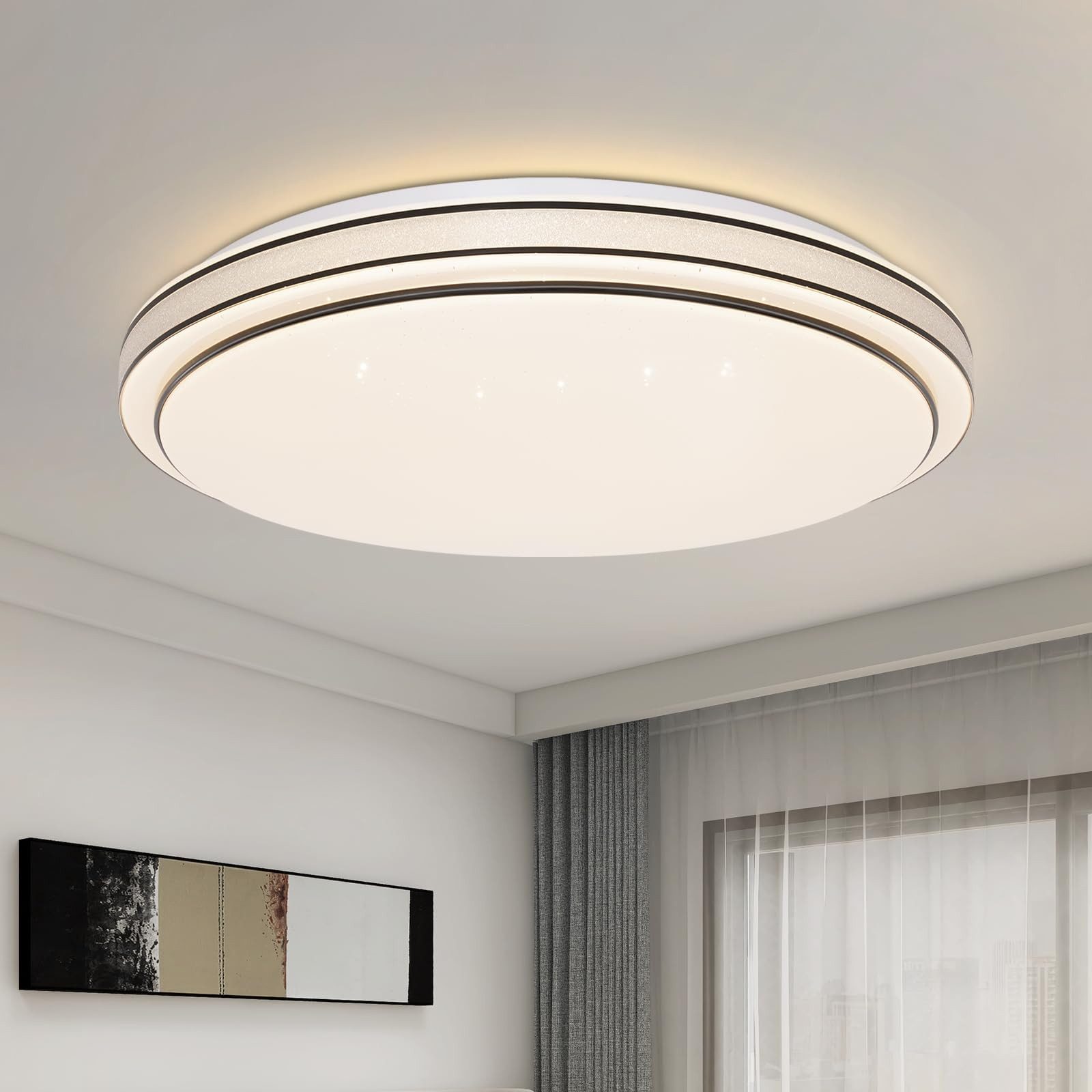 [Sternenhimmel-Design] Die Deckenleuchte hat einen Lampenschirm, der mit vielen kleinen LED-Lichtern gefüllt ist. Jede LED-Lampe repräsentiert einen Stern. Diese Sternenlichter sind an verschiedenen Positionen im Lampenschirm verteilt, um einen dynamischen und realistischen Sternenhimmel-Effekt zu erzeugen.