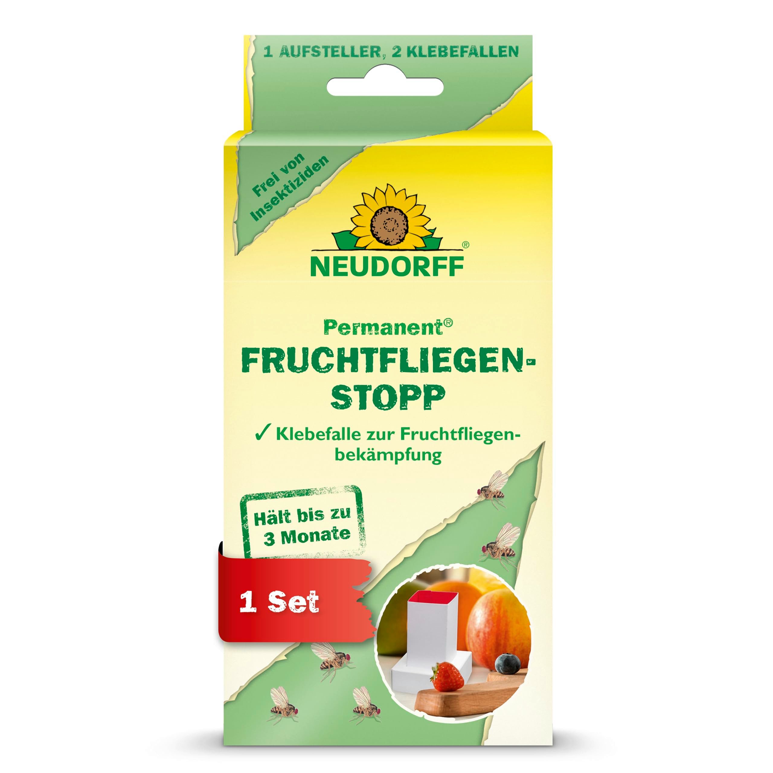 Art der Anwendung | **Wie wirkt das FruchtfliegenStopp?** Die Fruchtfliegen werden durch das in der Falle platzierte Obst angezogen bleiben bei Berührung mit der Klebewand kleben und können nicht mehr entweichen. Obst zeichnet sich durch eine sehr gute Lockwirkung aus. Sollten Sie einen Fruchtfliegenbefall feststellen kontrollieren Sie insbesondere Ihre Obstvorräte und vernichten Sie gegebenenfalls befallene Früchte. **Wann sollten Sie das FruchtfliegenStopp tauschen?** Eine Klebefalle kann bis zu drei Wochen verwendet werden wenn Sie die Obststücke in der Falle wöchentlich tauschen. Verwenden Sie am besten kleine reife Bananen- Apfel- oder Himbeerstücke. Denken Sie daran dass Obst nach einer Woche zu tauschen. Dadurch verhindern Sie dass neue Fliegenlarven entstehen. **Hinweis** Stellen Sie die befüllte Falle in bzw. neben die Obstschale oder in die Nähe der Befallsherde z.B. Bio- oder Abfalleimer |