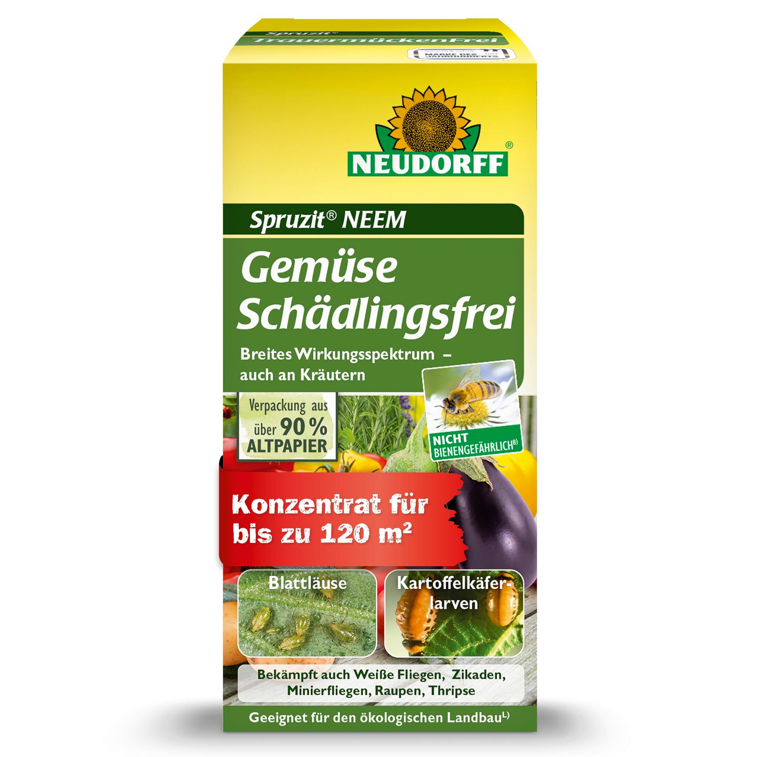 Anwendungsgebiet | Kartoffelkäfer (Larvenstadien 1 bis 3) an Kartoffeln im Freiland. Saugende Insekten (ausgenommen: Wanzen) beißende Insekten blattminierende Insekten (Junglarven) an frischen Kräutern (ausgenommen Schnittlauch) im Freiland Gewächshaus und auf Balkonen sowie an Spinat und verwandten Arten im Freiland. Saugende Insekten (ausgenommen: Wanzen) blattminierende Insekten an Tomate Zucchini Gurke Kürbis [Flaschen- Garten- Moschus- Riesenkürbis (mit genießbarer Schale)] Aubergine im Freiland Gewächshaus und auf Balkonen sowie Gemüsepaprika im Gewächshaus. Saugende beißende und blattminierende Insekten (Junglarven) an Kopfkohlen (Weiß- Rot- Spitz- Rosen- und Wirsingkohl) im Freiland. Trauermücken (Larven) an Zierpflanzen (Jungpflanzen) im Gewächshaus Saugende beißende und blattminierende Insekten Weiße Fliegen (Junglarven) an Zierpflanzen (ausgenommen: Birne Zierkoniferen) im Freiland Gewächshaus in Zimmern Büroräumen und auf Balkonen. * Nach eigenen Erfahrungen werden Spinnmilben Weiße Fliege und Wanzen bei der Sprühanwendung gegen Saugende Insekten miterfasst (Nebenwirkung). * Nach eigenen Erfahrungen wirkt sich das Mittel im Rahmen der Sprühanwendung gegen Saugende Insekten auch gegen Schmier- und Schildläuse befallsmindernd aus (Nebenwirkung). Die Population wird reduziert. * Nach eigenen Erfahrungen können im Rahmen der Sprühanwendung gegen Beißende Insekten auch Dickmaulrüssler und andere Käferarten über Störung der Larvenentwicklung sowie der Eiablage miterfasst werden (Nebenwirkung). Eine Vermehrung der Population kann reduziert werden. * Nach eigenen Erfahrungen werden Buchsbaum-Gallmücken und Buchsbaum-Blattflöhe bei der Sprühanwendung gegen Buchsbaum-Zünslerraupen miterfasst (Nebenwirkung). |