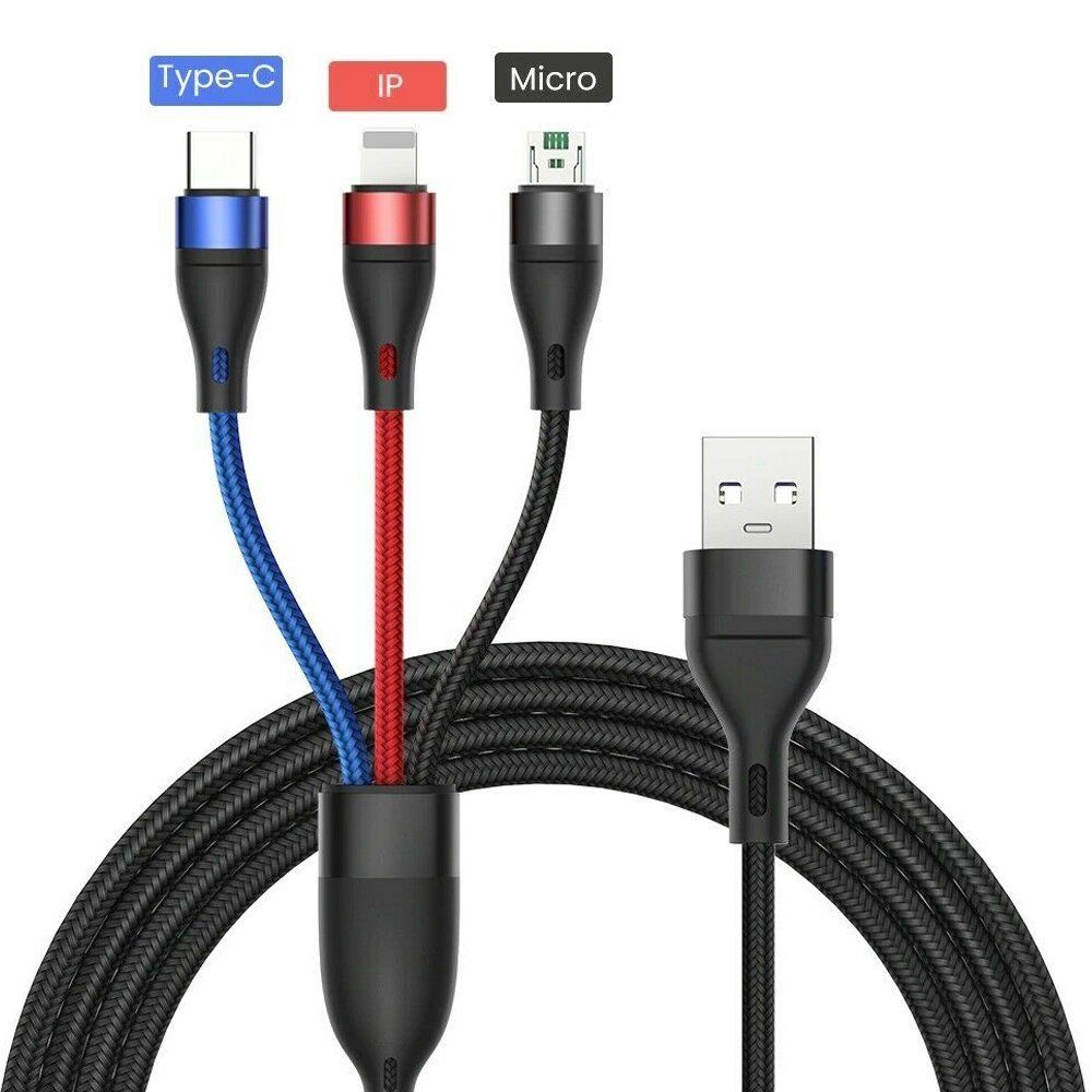 Mit diesem 3-in-1-Ladekabel können 3 verschiedene Anschlussgeräte aufgeladen werden, darunter Micro-USB-, USB-Typ-C- und Apple-Kabel.