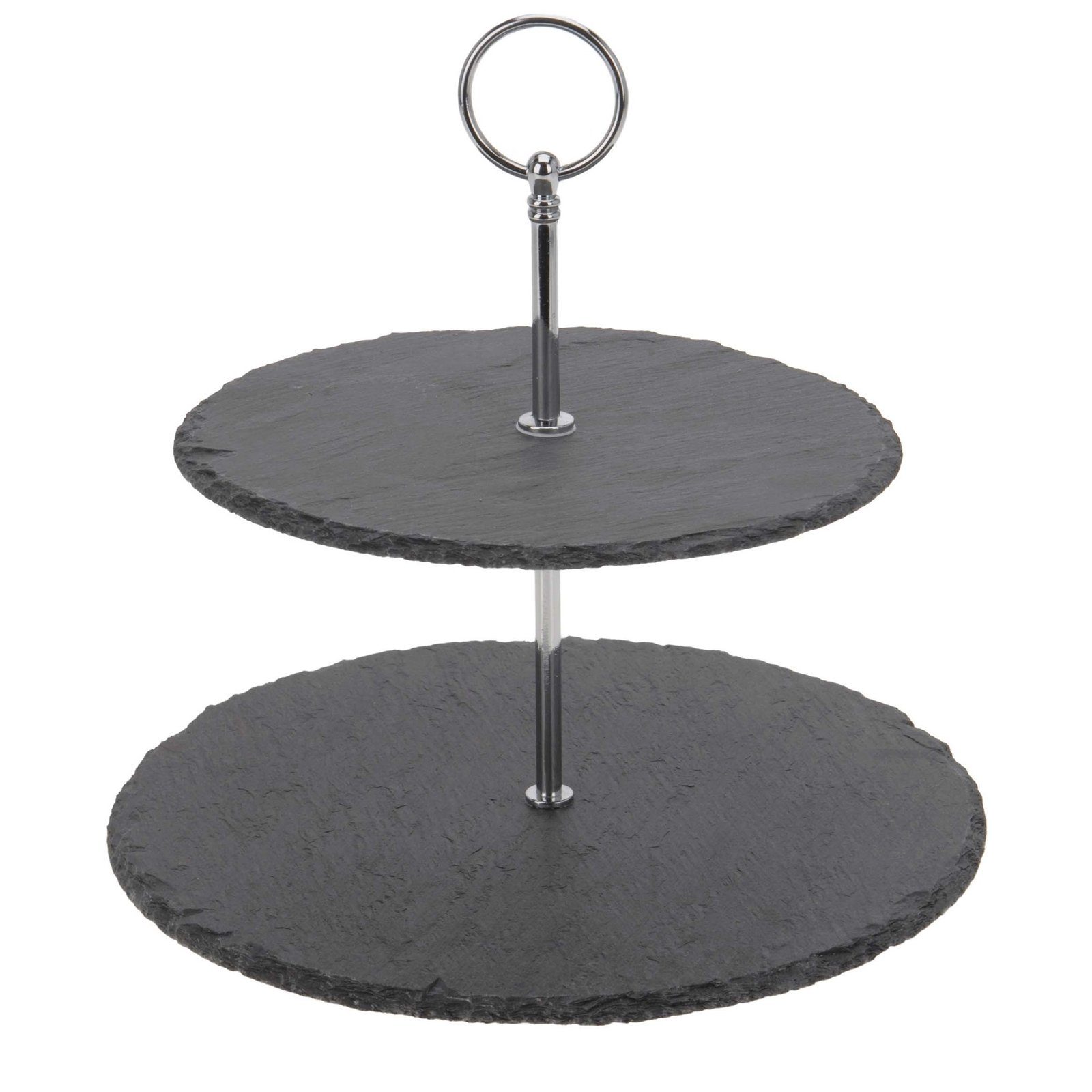 Diese Etagere ist perfekt für den täglichen Gebrauch in Ihrer Küche oder im Ess- und Wohnbereich geeignet. Auf den 2 runden Ablagen aus Schiefer kommen viele kleine Leckereien erst so richtig zur Geltung. Auch auf der nächsten Party, oder Familienfeier macht diese Servierplatte auf der Tafel so richtig was her. Setzen Sie Ihre Speisen doch ganz einfach so richtig in Szene. Die Ablagen sind aus Schiefer und der Stab ist verchromtes Messing. Sie können ganz beruhigt Ihre Lebensmittel auf den Ablagen präsentieren, denn die Oberfläche ist lebensmittelechtem Speziallack versiegelt und somit auch fett-und wasserfest. Vier kleine Gummifüße sorgen für einen sicheren Stand. Maße: H 23 cm, Durchmesser untere Platte 25 cm, Durchmesser obere Platte 20 cm