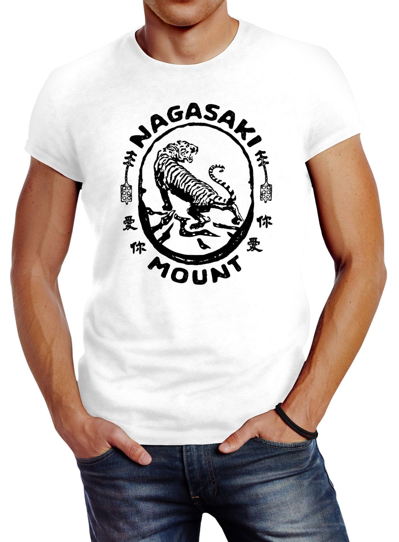 • Herren T-Shirt mit angesagtem Tiger Print der Marke Neverless® Kombiniert mit japanischen Schriftzeichen und Nagasaki Mount Schriftzug ist dieses Design toller Eyecatcher.und mit J