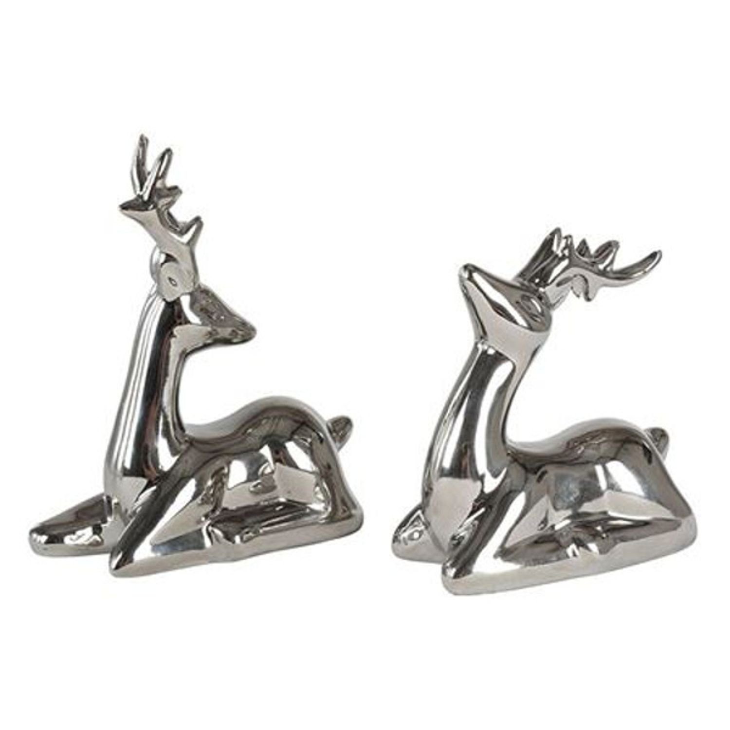 Wunderschöne silberfarbene Deko-Hirsche aus Keramik für die moderne Innendekoration. Zur saisonalen Verschönerung von Kommoden, Vitrinen und Fensterbänken während der Herbst- und Winterzeit.