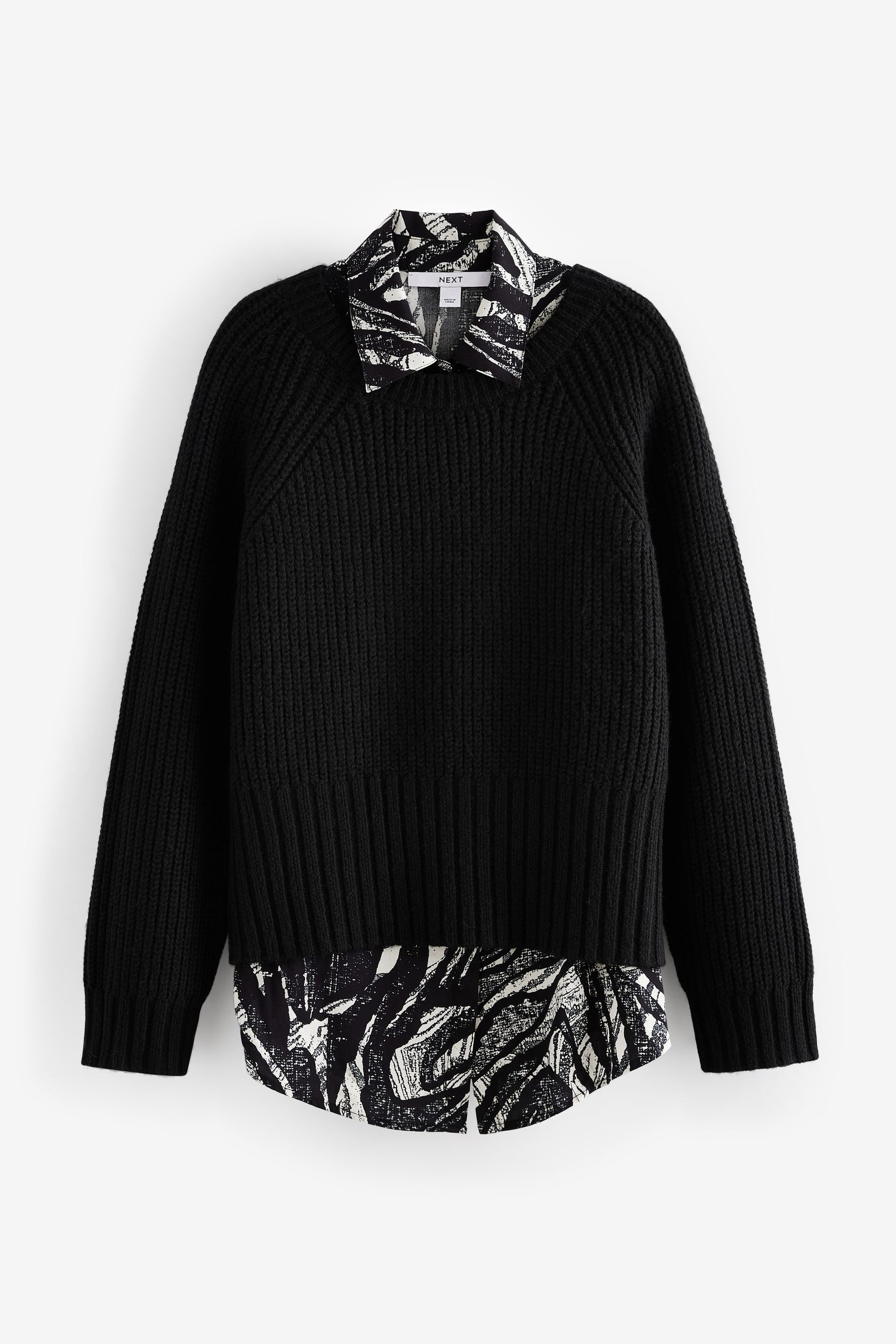 Materialzusammensetzung | Pullover: 37 % Polyester, 33 % Polyester (recycelt), 20 % Polyacryl, 10 % Polyamid. Hemd (Webteil): 100 % Polyester. |