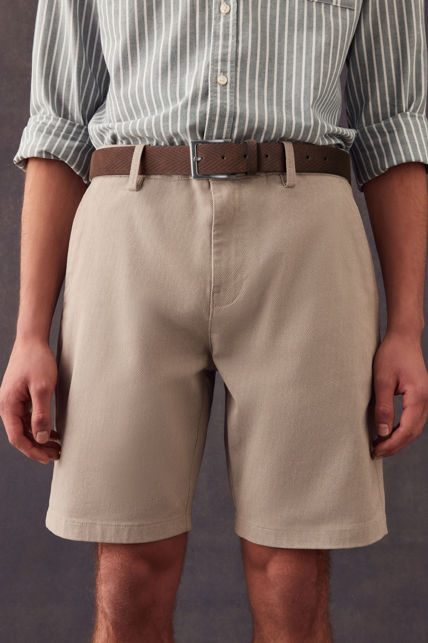 Materialzusammensetzung | Shorts, Hauptmaterial: 98 % Baumwolle, 2 % Elasthan. Besatz: 65 % Polyester, 35 % Baumwolle. Gürtel: 100 % Polyurethan. |