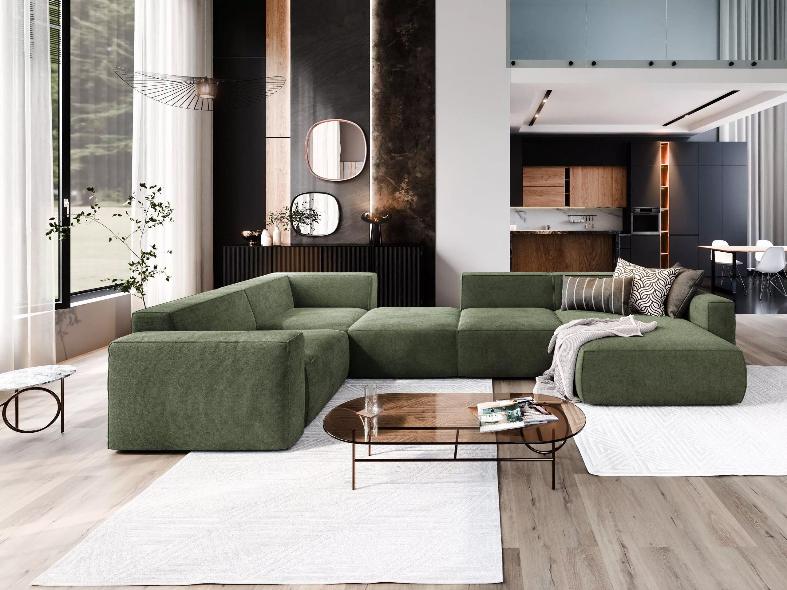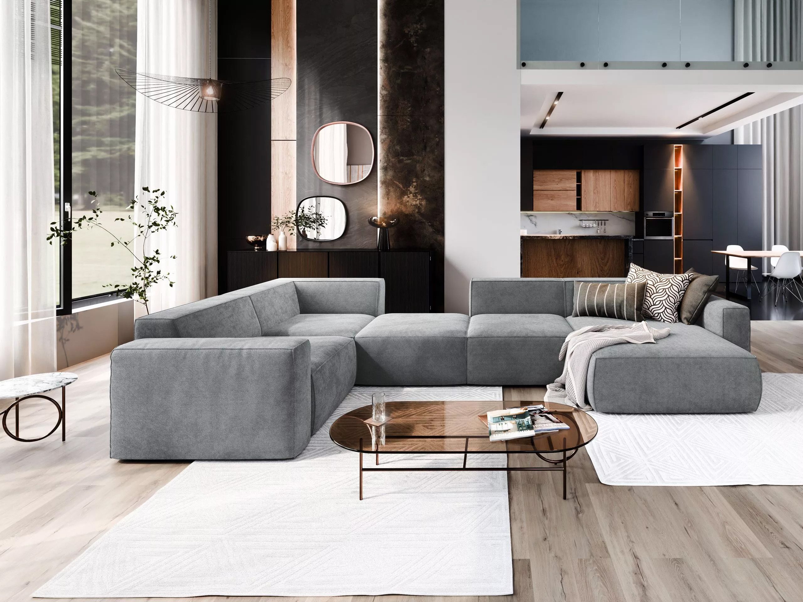 Die Sitzflächen des Ecksofas sind mit hochflexiblem HR-Schaumstoff gefüllt, der sich perfekt an die Körperform anpasst und für hohen Nutzungskomfort und jahrelange Haltbarkeit sorgt. Die Füllung wird durch eine gewellte Feder ergänzt, die die Flexibilität und Stabilität der Struktur weiter verbessert und eine ideale Unterstützung für die Figur bietet. Die Polsterung besteht aus einem weichen, angenehmen Stoff, der dem täglichen Gebrauch standhält und leicht zu pflegen ist. Die breiten Module und die geometrische Linie verleihen dem Ecksofa eine moderne und zugleich gemütliche Ausstrahlung.