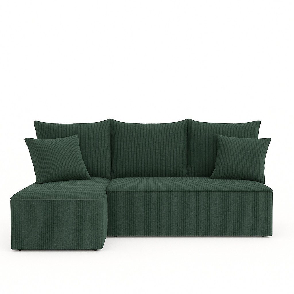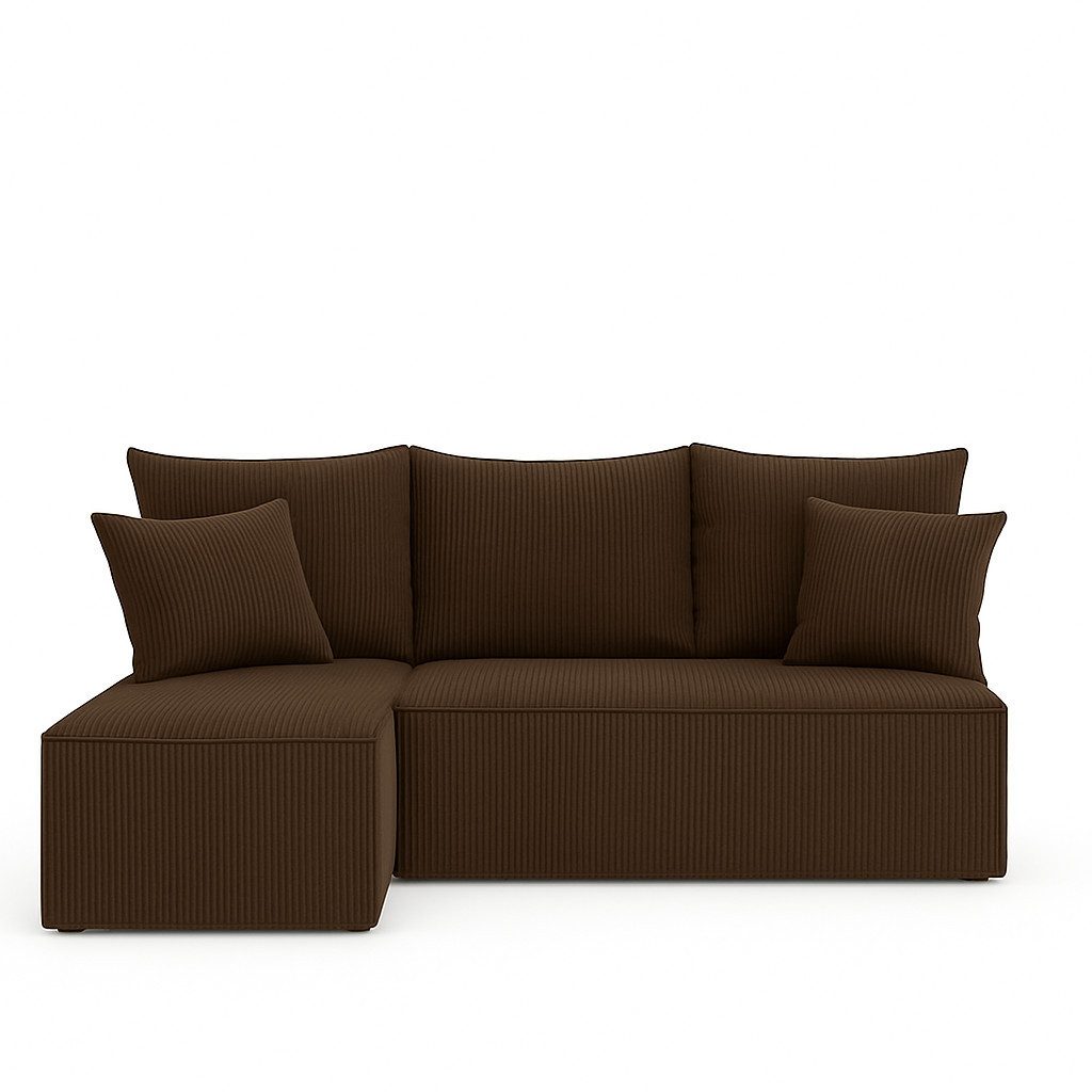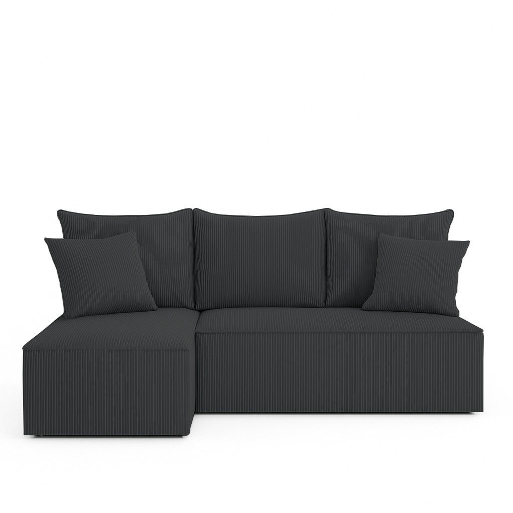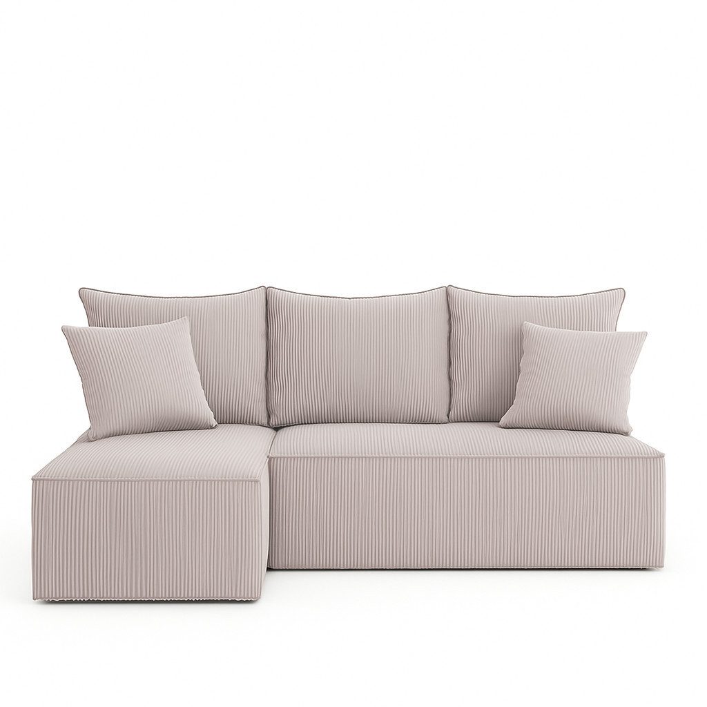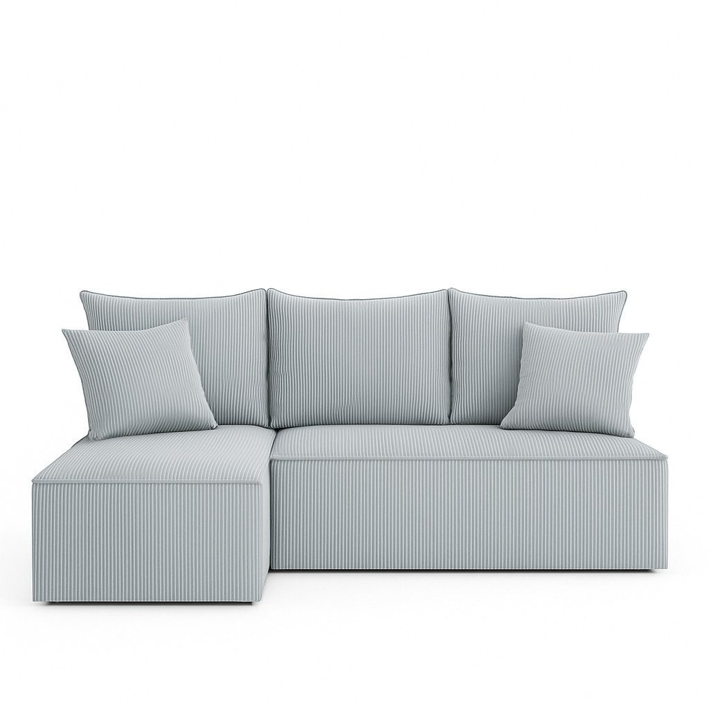 Das moderne Ecksofa mit Schlaffunktion vereint Komfort und Funktionalität in einer eleganten, minimalistischen Form. Seine geometrische Form fügt sich perfekt in die Ästhetik zeitgenössischer Interieurs ein und verleiht ihnen Gemütlichkeit und Stil. Das Ecksofa wurde für die alltägliche Entspannung konzipiert, eignet sich aber dank seiner großen Liegefläche von 200 × 130 cm auch als bequemes Bett für Gäste. Die lose Rückenlehne und die dekorativen Kissen tragen nicht nur zum Komfort bei, sondern unterstreichen auch den modernen Charakter des Möbelstücks