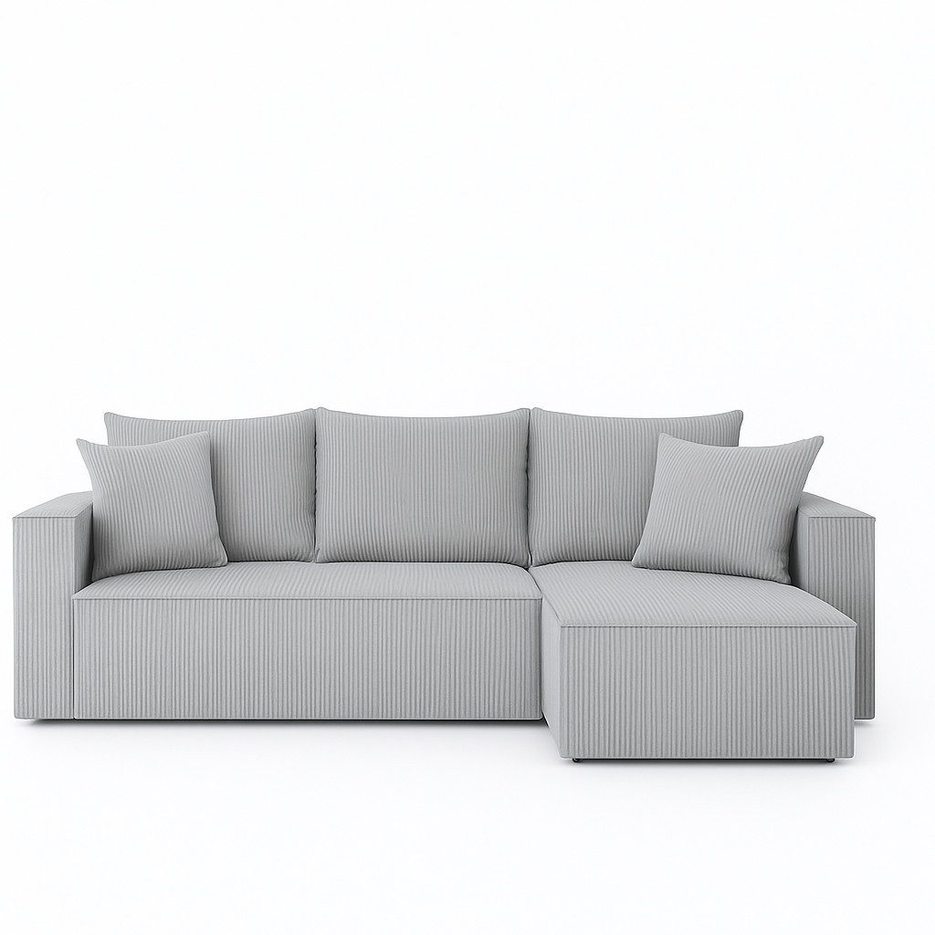 Das moderne Ecksofa mit Schlaffunktion vereint Komfort und Funktionalität in einer eleganten, minimalistischen Form. Seine geometrische Form fügt sich perfekt in die Ästhetik zeitgenössischer Interieurs ein und verleiht ihnen Gemütlichkeit und Stil. Das Ecksofa wurde für die alltägliche Entspannung konzipiert, eignet sich aber dank seiner großen Liegefläche von 200 × 130 cm auch als bequemes Bett für Gäste. Die lose Rückenlehne und die dekorativen Kissen tragen nicht nur zum Komfort bei, sondern unterstreichen auch den modernen Charakter des Möbelstücks
