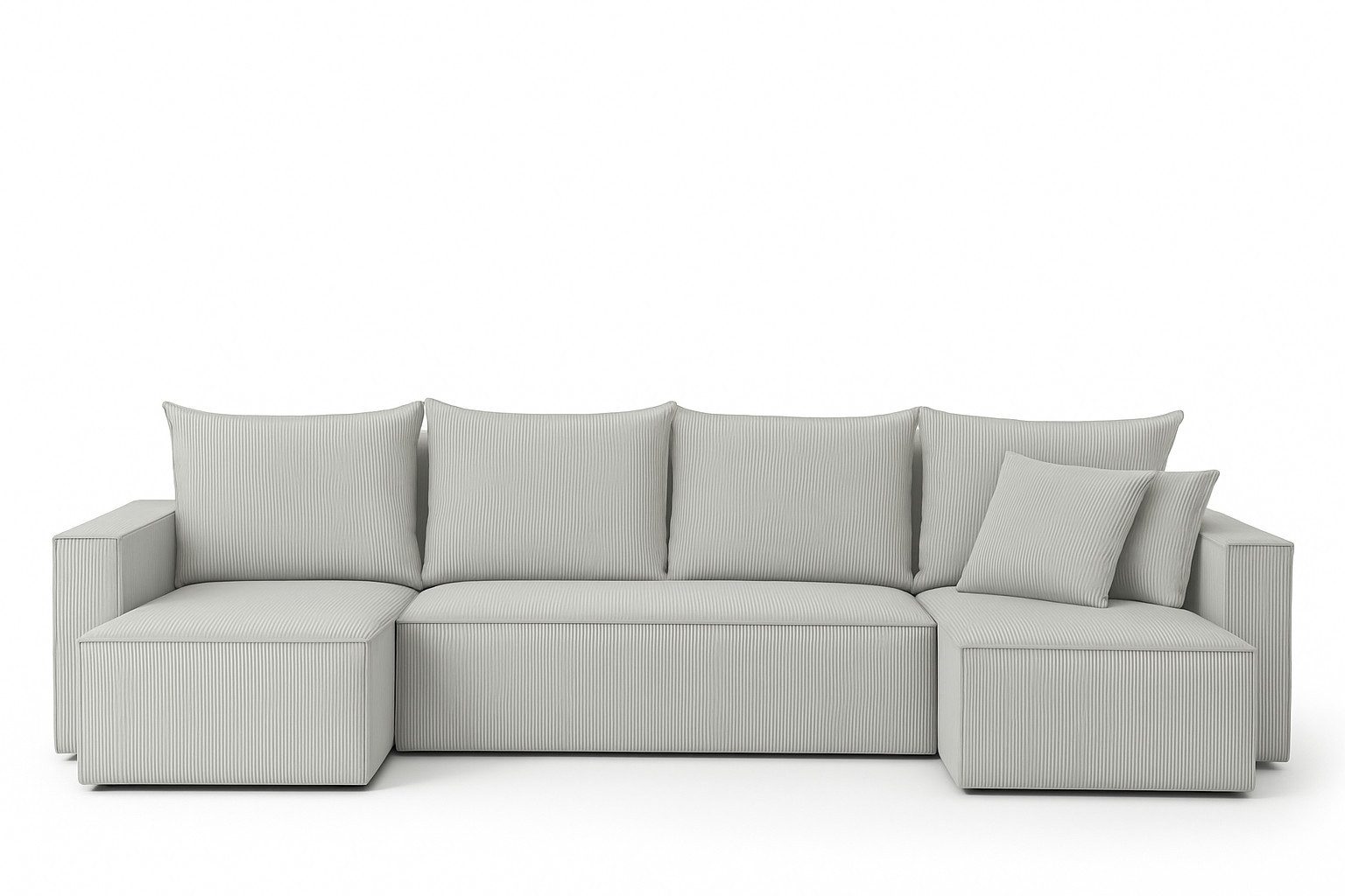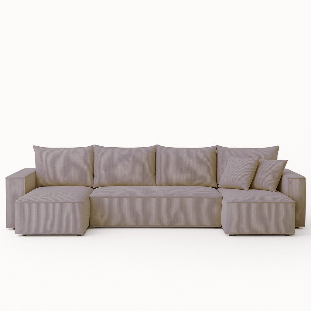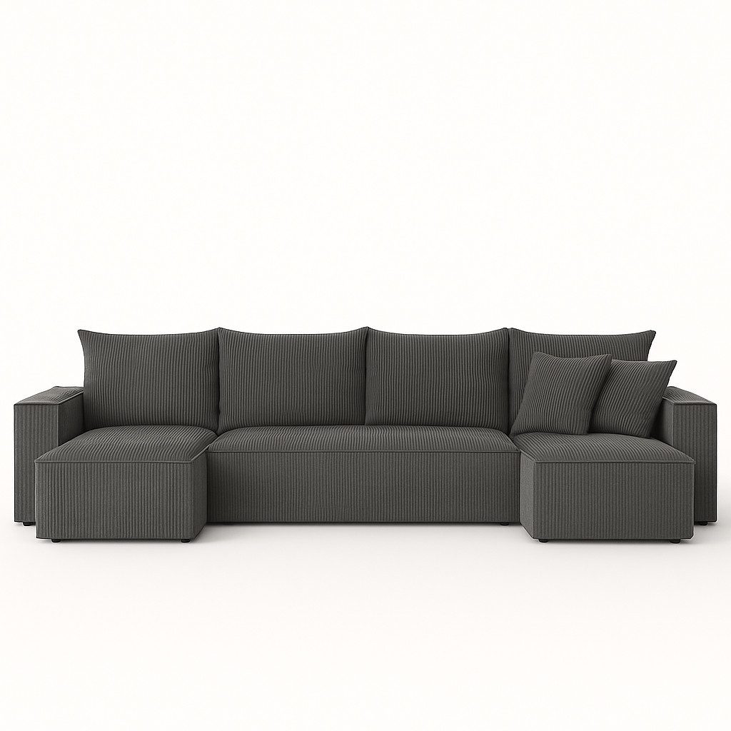 Das moderne Ecksofa mit Schlaffunktion vereint Komfort und Funktionalität in einer eleganten, minimalistischen Form. Seine geometrische Form fügt sich perfekt in die Ästhetik zeitgenössischer Interieurs ein und verleiht ihnen Gemütlichkeit und Stil. Das Ecksofa wurde für die alltägliche Entspannung konzipiert, eignet sich aber dank seiner großen Liegefläche von 275 × 130 cm auch als bequemes Bett für Gäste. Die lose Rückenlehne und die dekorativen Kissen tragen nicht nur zum Komfort bei, sondern unterstreichen auch den modernen Charakter des Möbelstücks