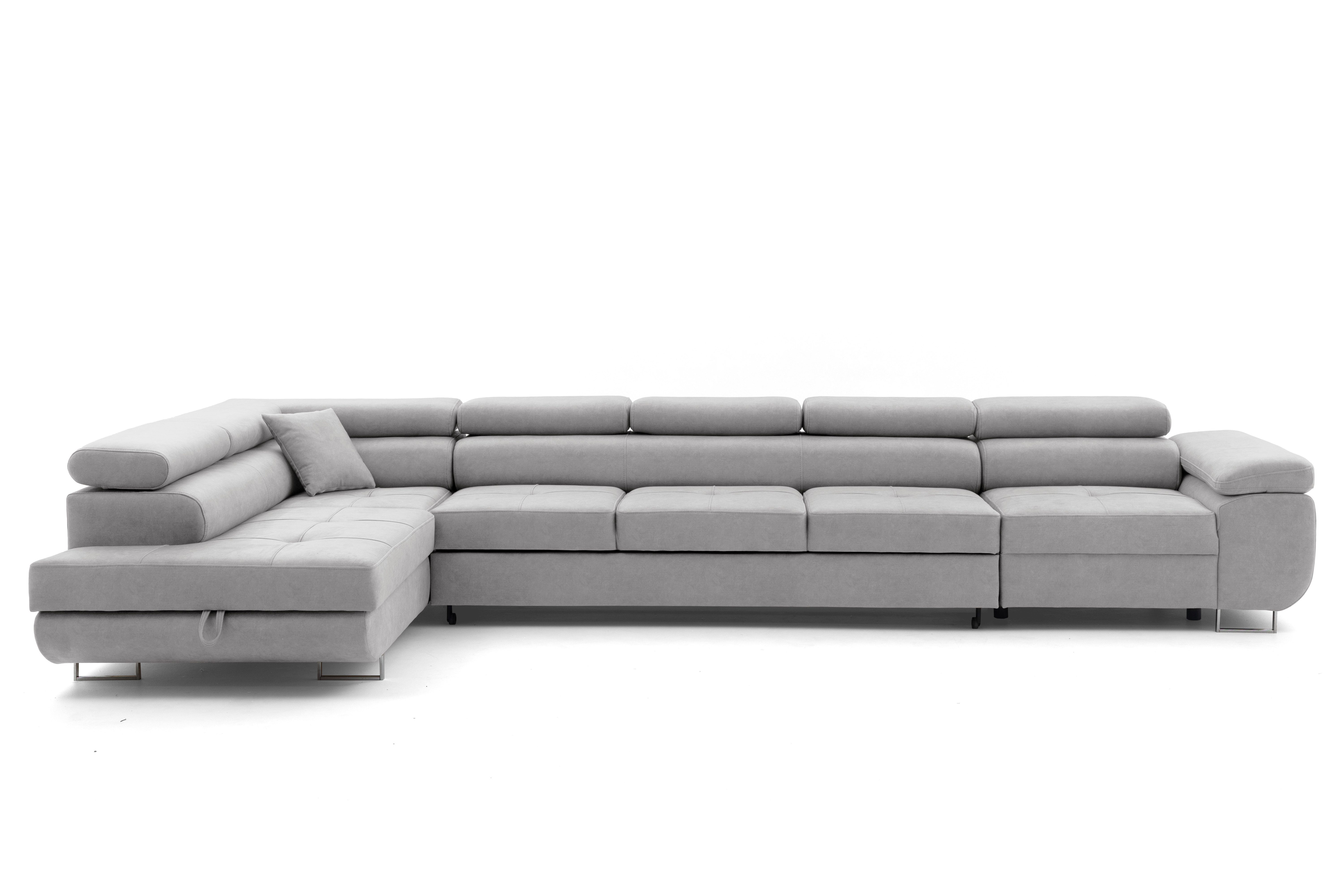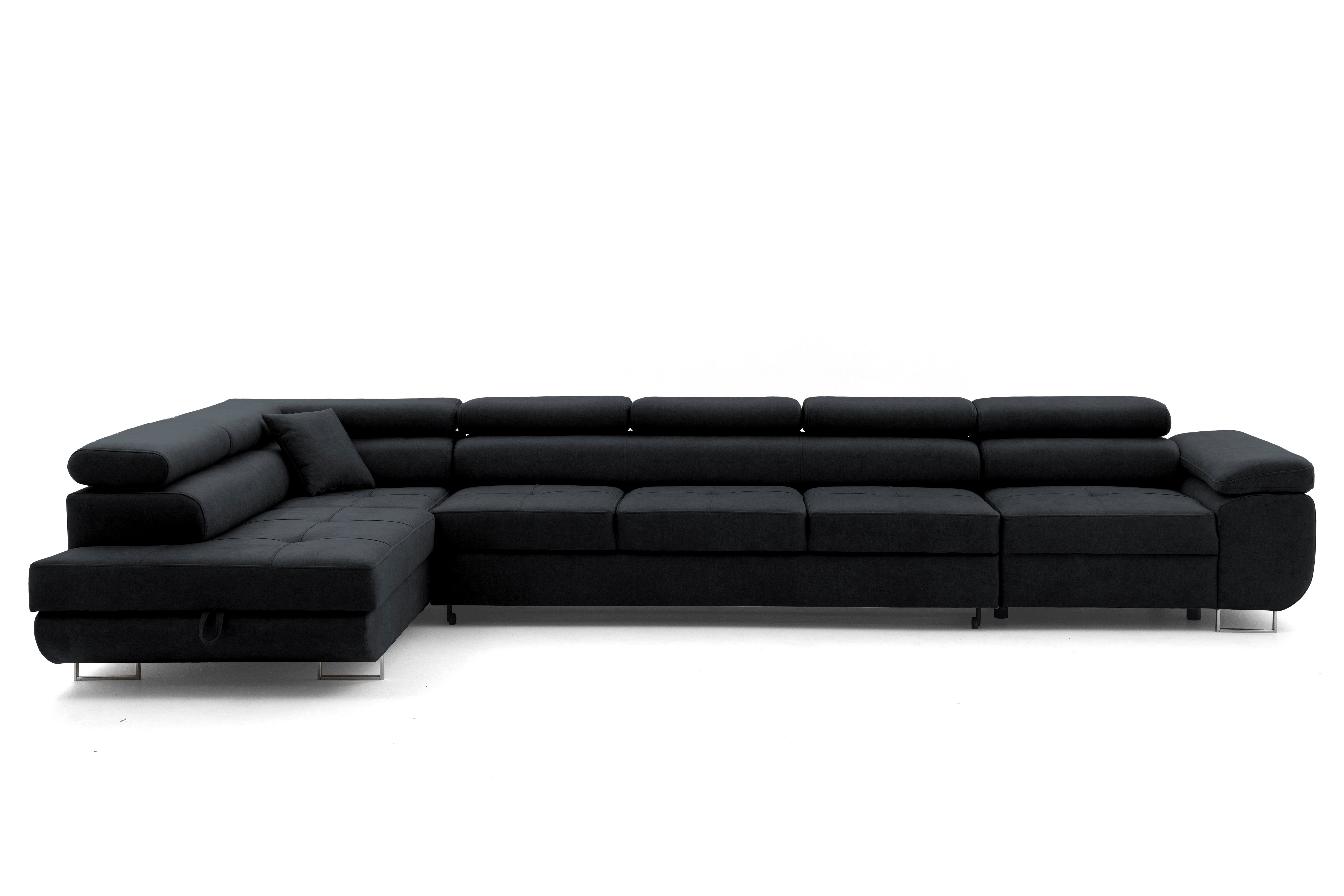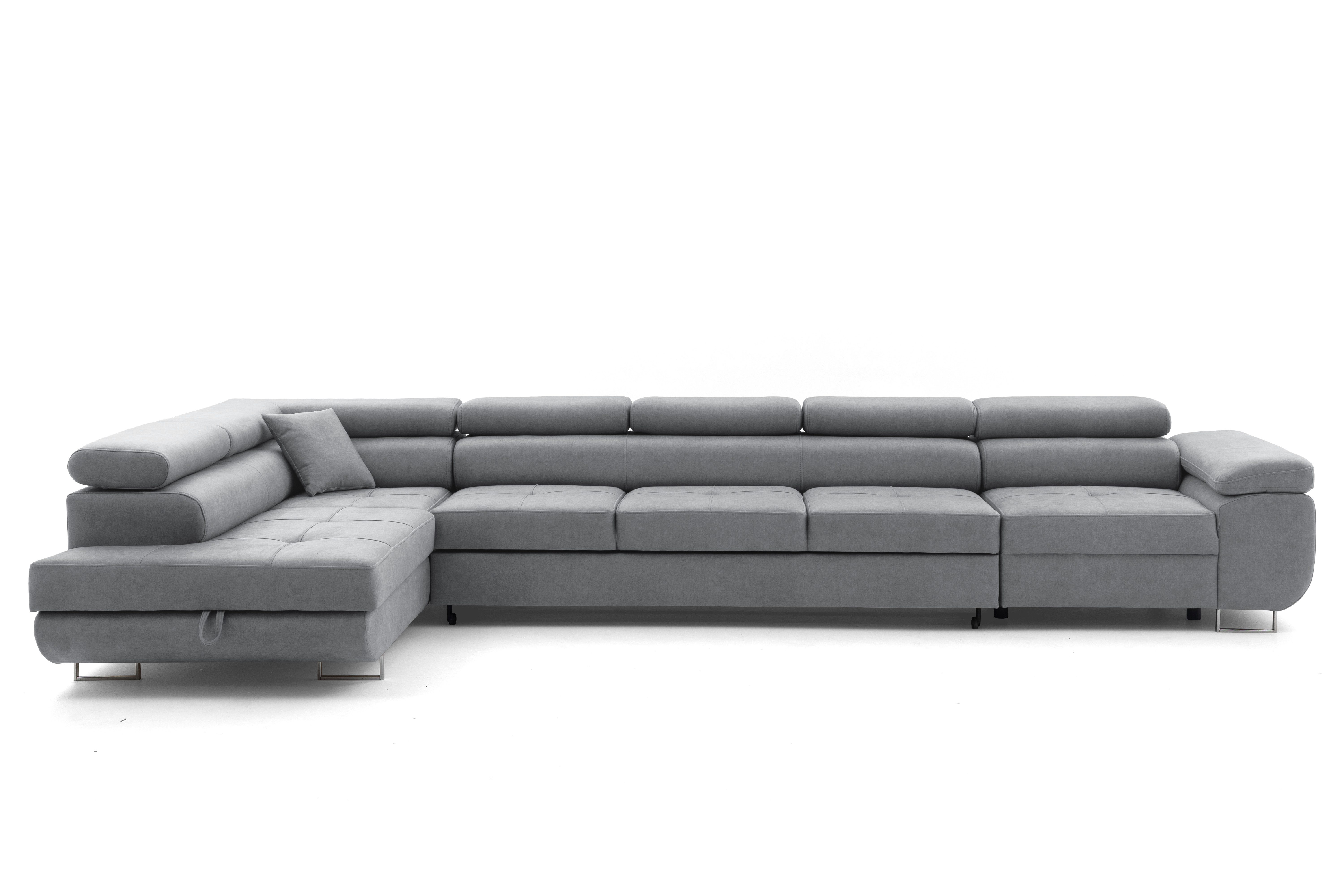 Das Ecksofa WILD XXL ist ein exklusives Modell, das für geräumige, moderne Innenräume entwickelt wurde. Es verbindet einen eleganten Look mit hoher Funktionalität und bietet außergewöhnlichen Komfort für den täglichen Gebrauch und die Möglichkeit, gelegentlich zu schlafen. Die moderne Linie des Möbels, die verstellbaren Kopfstützen und die massiven, hohen Beine von 9 cm verleihen dem Ecksofa seine Leichtigkeit und lassen es sowohl in den Raum eines heimischen Wohnzimmers als auch in repräsentative Wohnungen perfekt passen. Dank der großen Liegefläche und der sorgfältigen Verarbeitung garantiert das Ecksofa WILD XXL nicht nur Komfort, sondern auch eine repräsentative Raumgestaltung.
