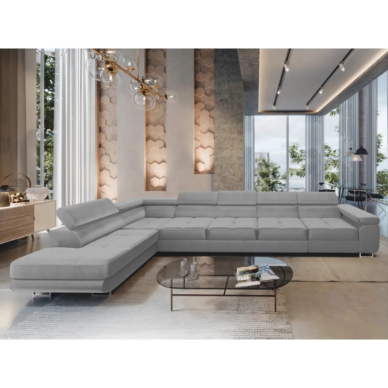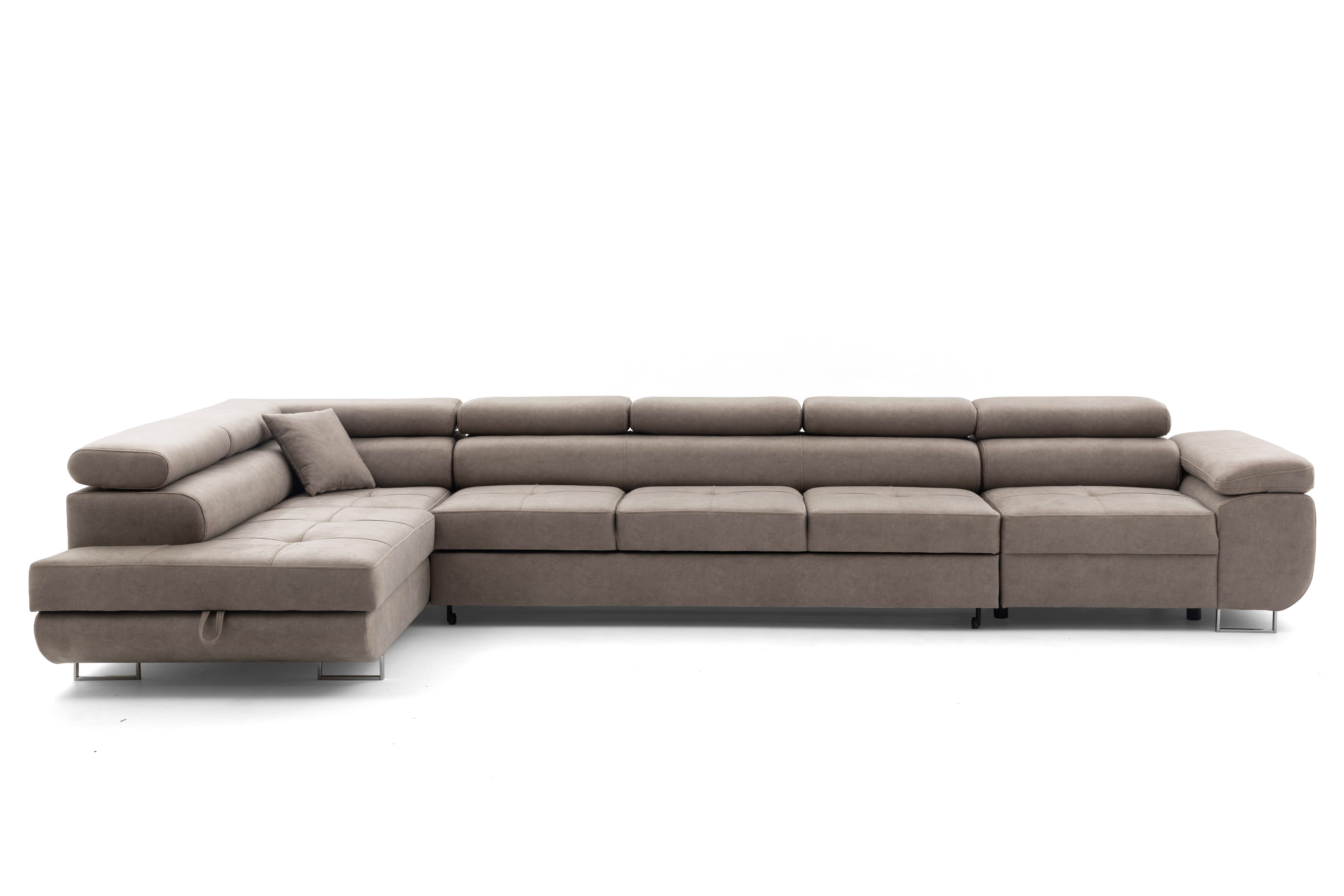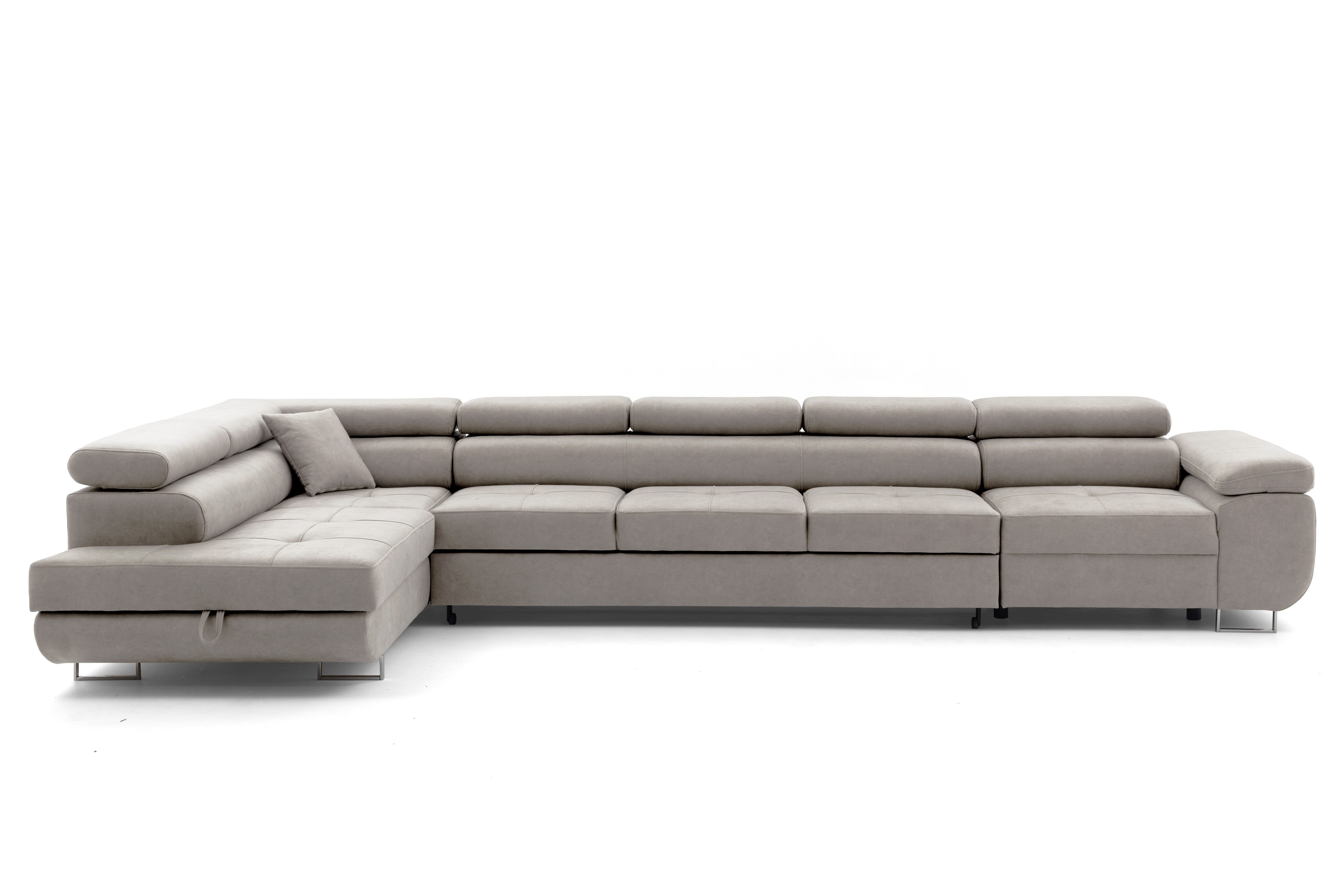 Das Ecksofa WILD XXL ist ein exklusives Modell, das für geräumige, moderne Innenräume entwickelt wurde. Es verbindet einen eleganten Look mit hoher Funktionalität und bietet außergewöhnlichen Komfort für den täglichen Gebrauch und die Möglichkeit, gelegentlich zu schlafen. Die moderne Linie des Möbels, die verstellbaren Kopfstützen und die massiven, hohen Beine von 9 cm verleihen dem Ecksofa seine Leichtigkeit und lassen es sowohl in den Raum eines heimischen Wohnzimmers als auch in repräsentative Wohnungen perfekt passen. Dank der großen Liegefläche und der sorgfältigen Verarbeitung garantiert das Ecksofa WILD XXL nicht nur Komfort, sondern auch eine repräsentative Raumgestaltung.